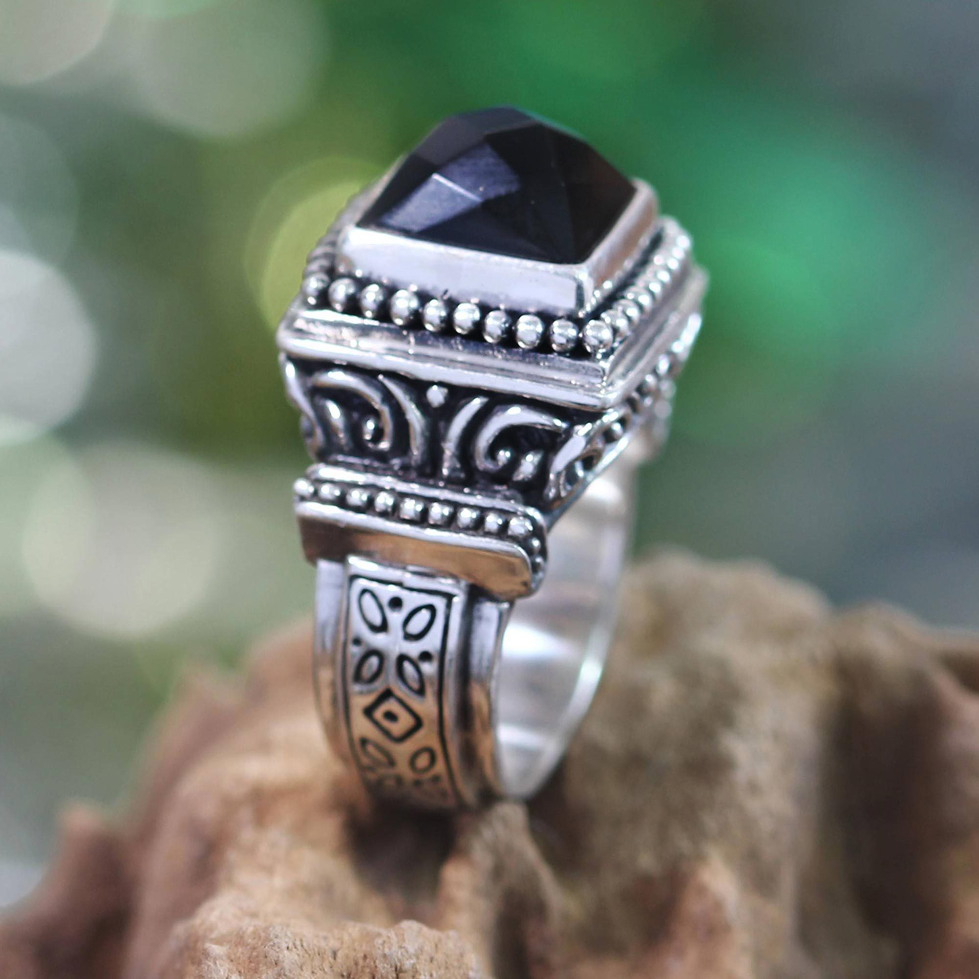 Ornate settings evoke a splendid temple at midnight. Crowned with faceted black onyx, this stunning ring is crafted by hand. Bali's Kadek Hendra works in sterling silver, taking his inspiration from traditional Indonesian art.