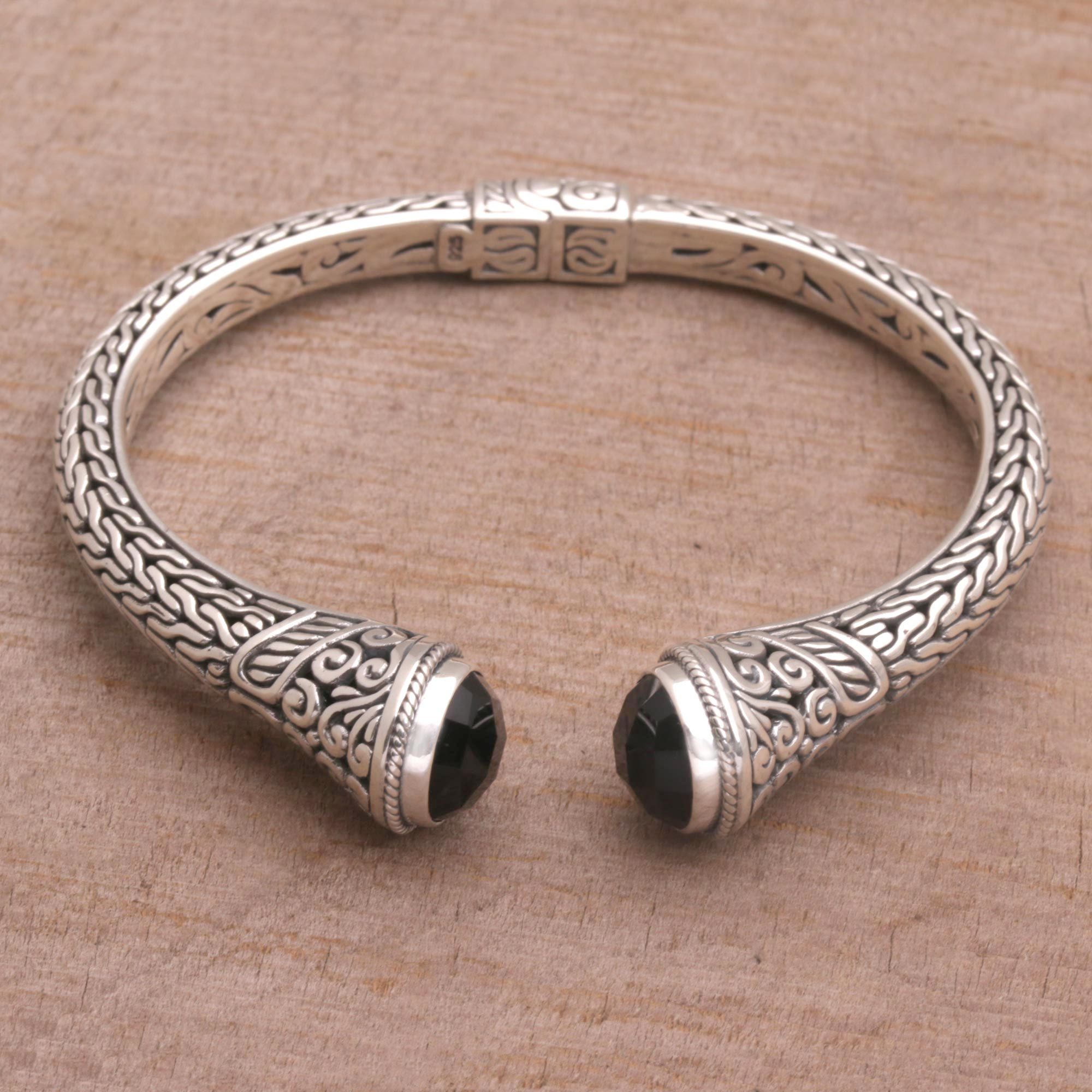 Intricate swirl motifs exude Balinese style in this cuff bracelet by Komang Wijayana. Handcrafted from sterling silver, the cuff features two onyx stones totaling nine carats. An artfully concealed hinge makes it easy to put on and take off.