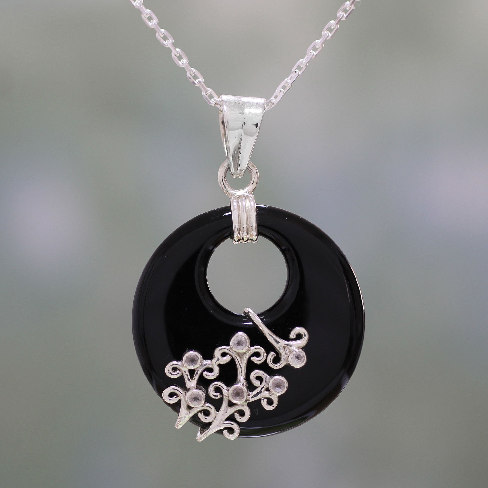 A wreath of black onyx is suspended from a sterling silver cable chain in this pendant necklace by Shubhra Singh. She works with local Indian artisans, who craft the pendant by hand with spiraling silver motifs, accented with petite stones of white topaz.