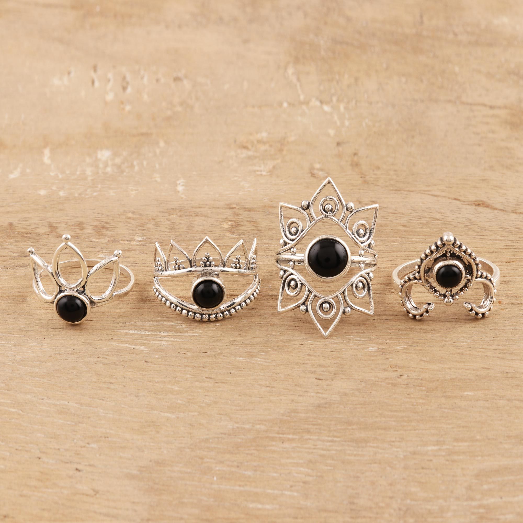 Magical in their beauty, this quartet of cocktail rings is designed by Neetu Barathi in India. Crafted by hand from sterling silver, each cocktail ring displays a distinct shape with intricate wire and dot work that frame a cabochon of gleaming black onyx. Use all four to complement an outfit or share them with your friends.