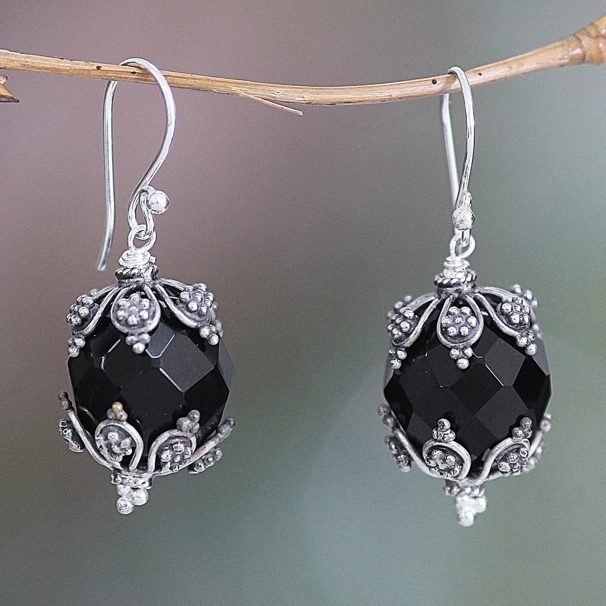 Ornate blossoms in sterling silver embrace faceted black globes. Sukartini's design sets onyx in feminine earrings of extraordinary elegance.