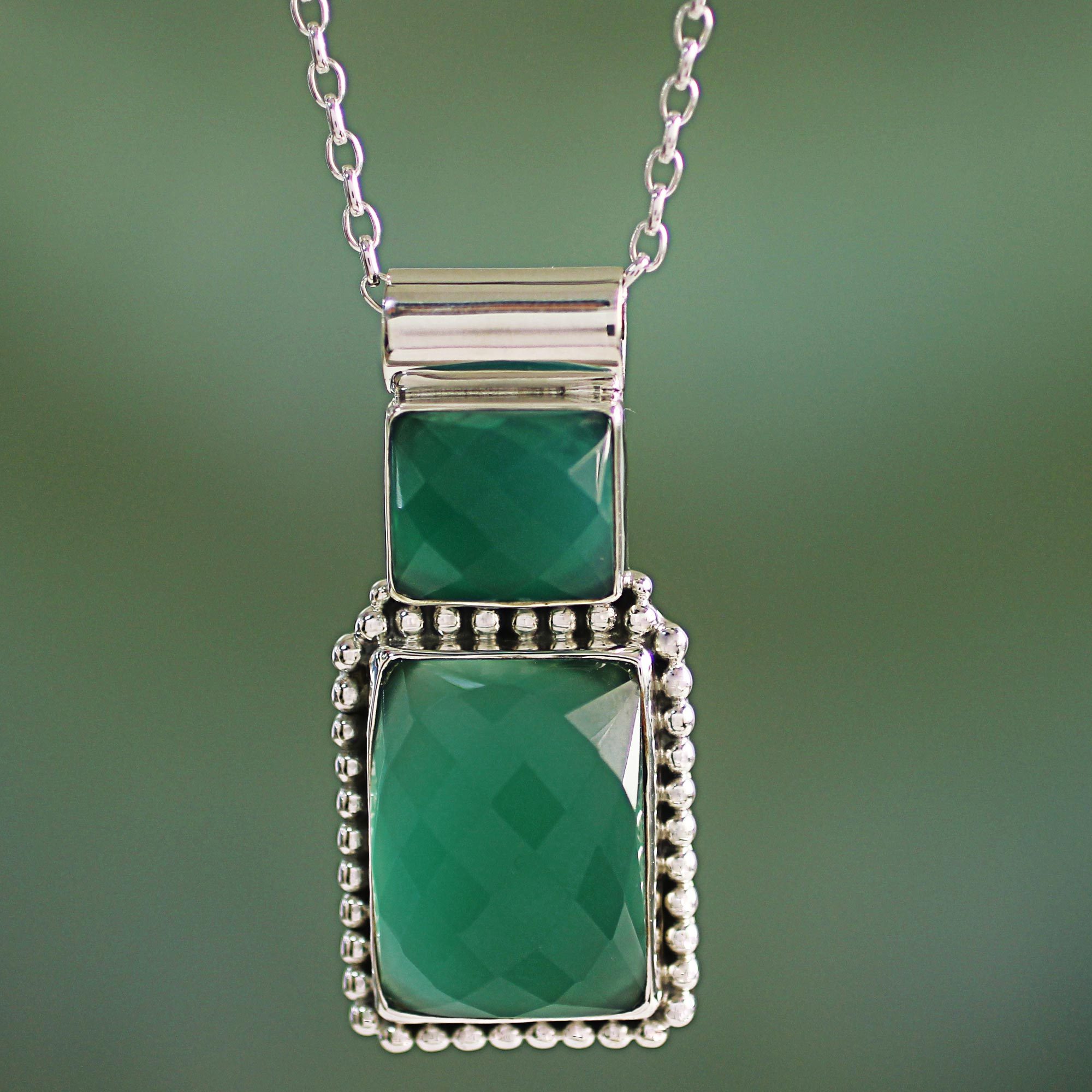Featuring over 17 carats of heat-treated onyx framed by sterling silver motifs, this piece is truly a sight to behold. Indian artisan Neeru Goel crafts each piece using green onyx stones meant to ward off negativity, inviting beauty with their calm, deep tones.