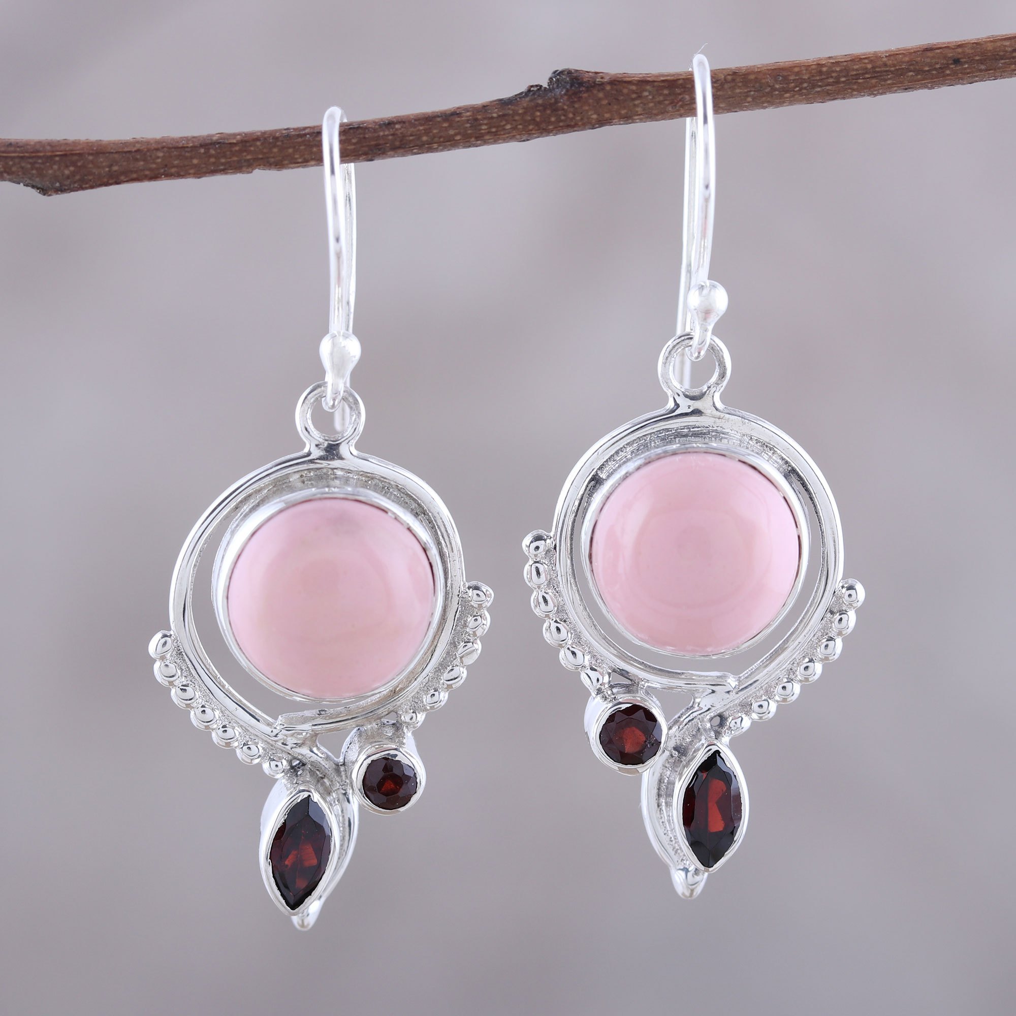 Illuminated by luminous garnet accents and high-polish sterling silver bezels, two round cabochons of pink opal are entrancing. Neeru Goel of India presents this fine pair of colorful dangle earrings that are sure to impress.