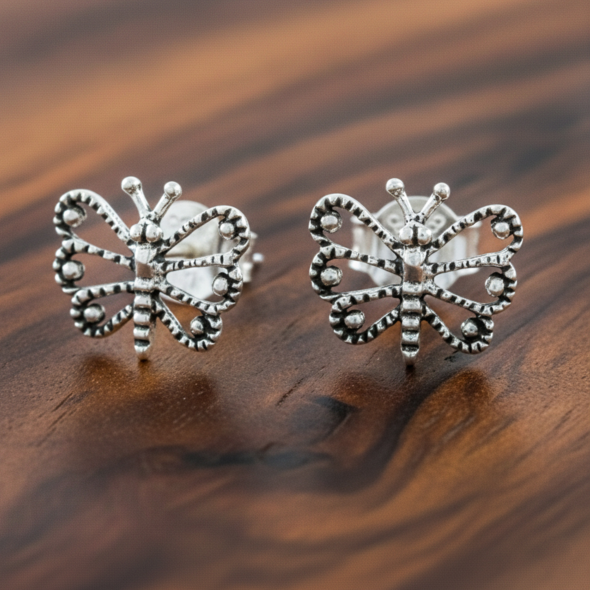 Two butterflies are crafted of sterling silver with lovely openwork designs, their wings dotted with a combination of finishes. Thailand's Wadarat Supasirisuk presents this pair of stud earrings, showcasing local craftsmanship.