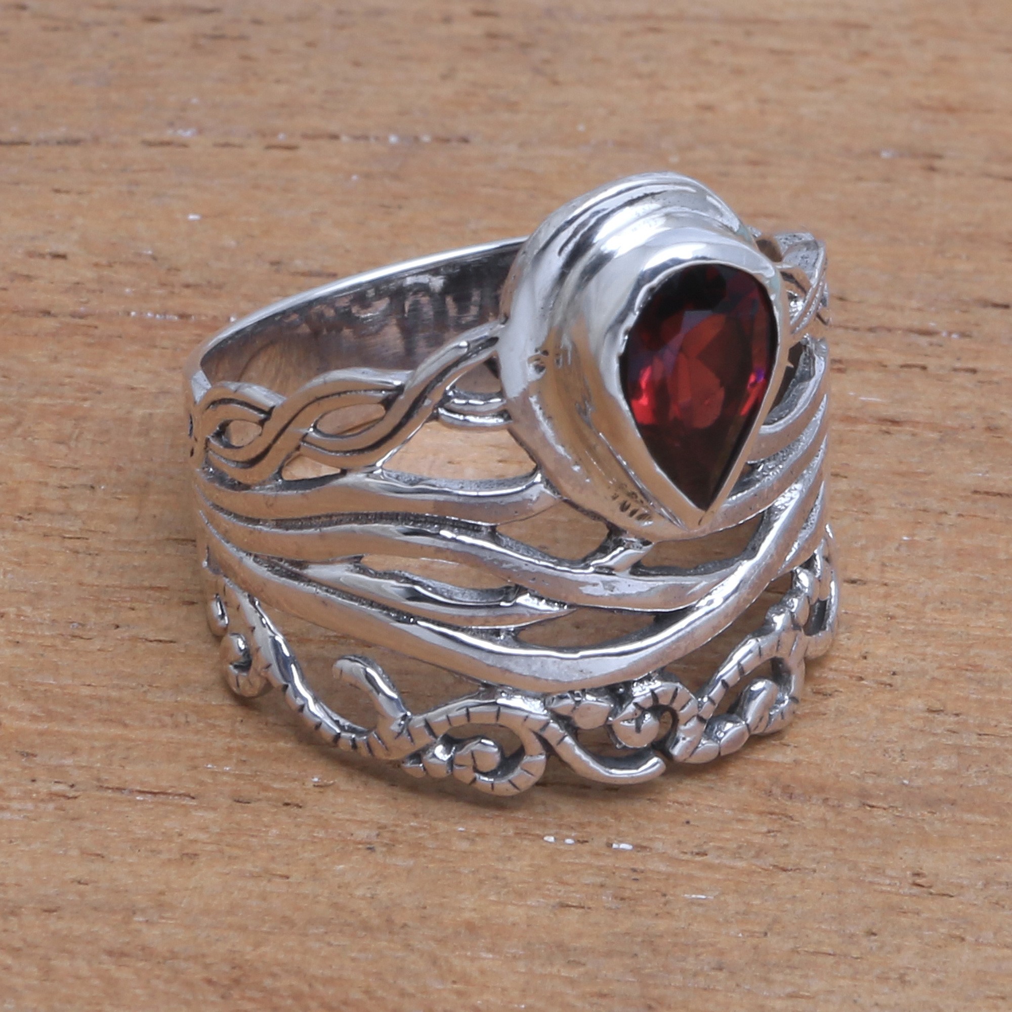 Inspired by the beauty of his home, Asmara Putra of Gianyar, Bali designs this stunning cocktail ring. Openwork sterling silver vine motifs weave and curl around the finger. A single teardrop gem of sparkling garnet completes this marvelous accessory.