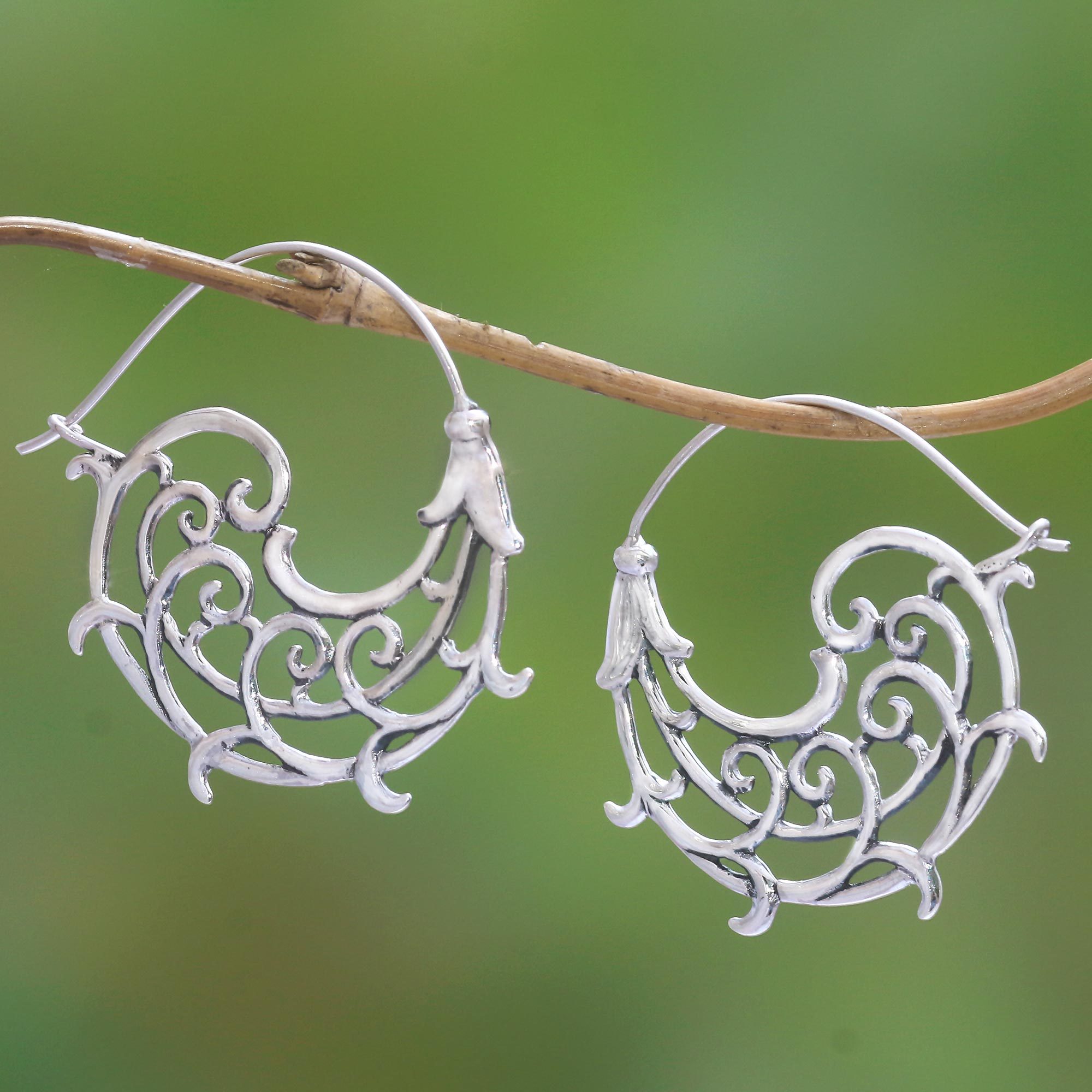 Crafted from sterling silver, elegant openwork tendrils curl below the ears. Balinese artisan Made Mustika designs these elegant hoop earrings.