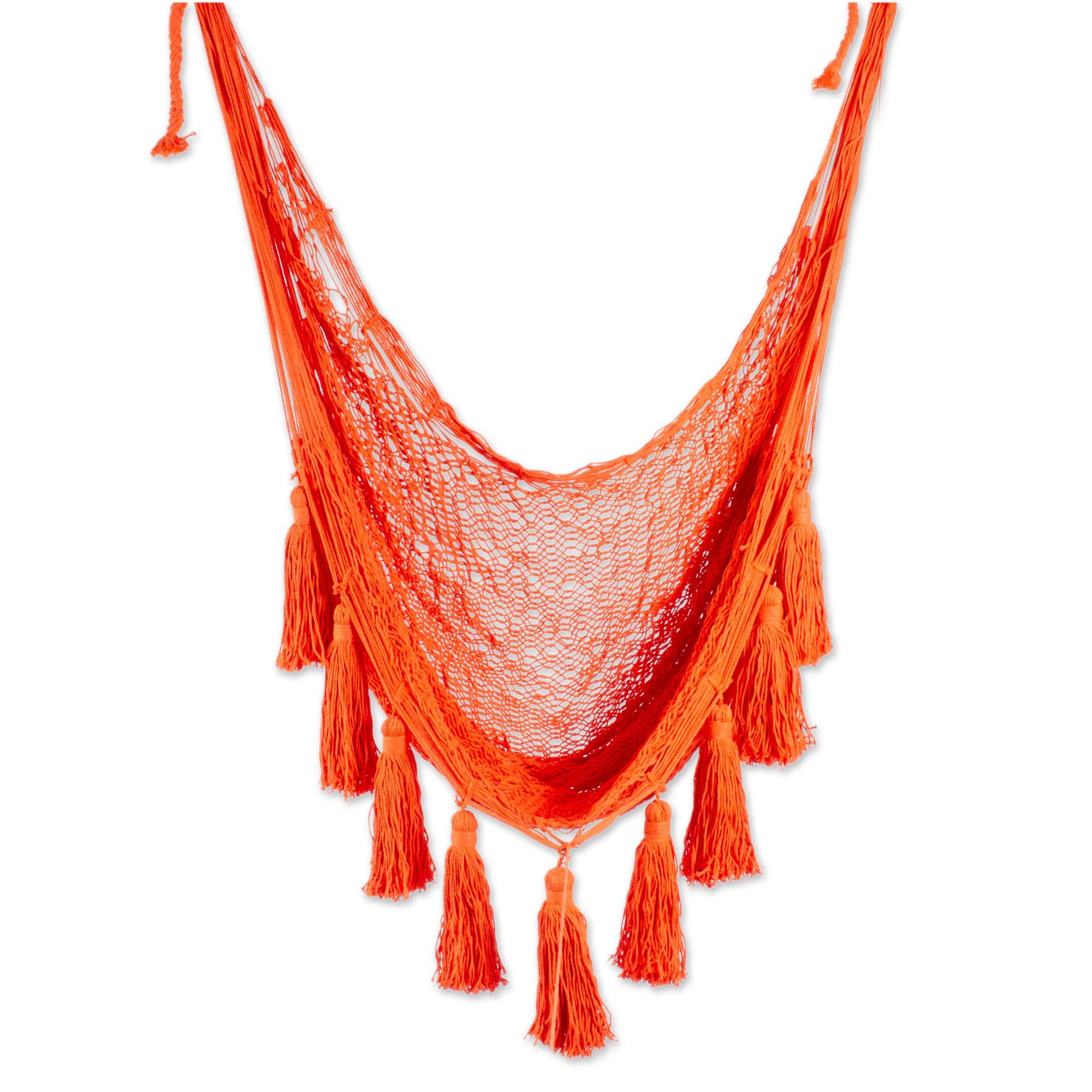 Orange Tasseled Cotton Rope Mayan Hammock Swing from Mexico, 'Ocean Seat in Orange'
