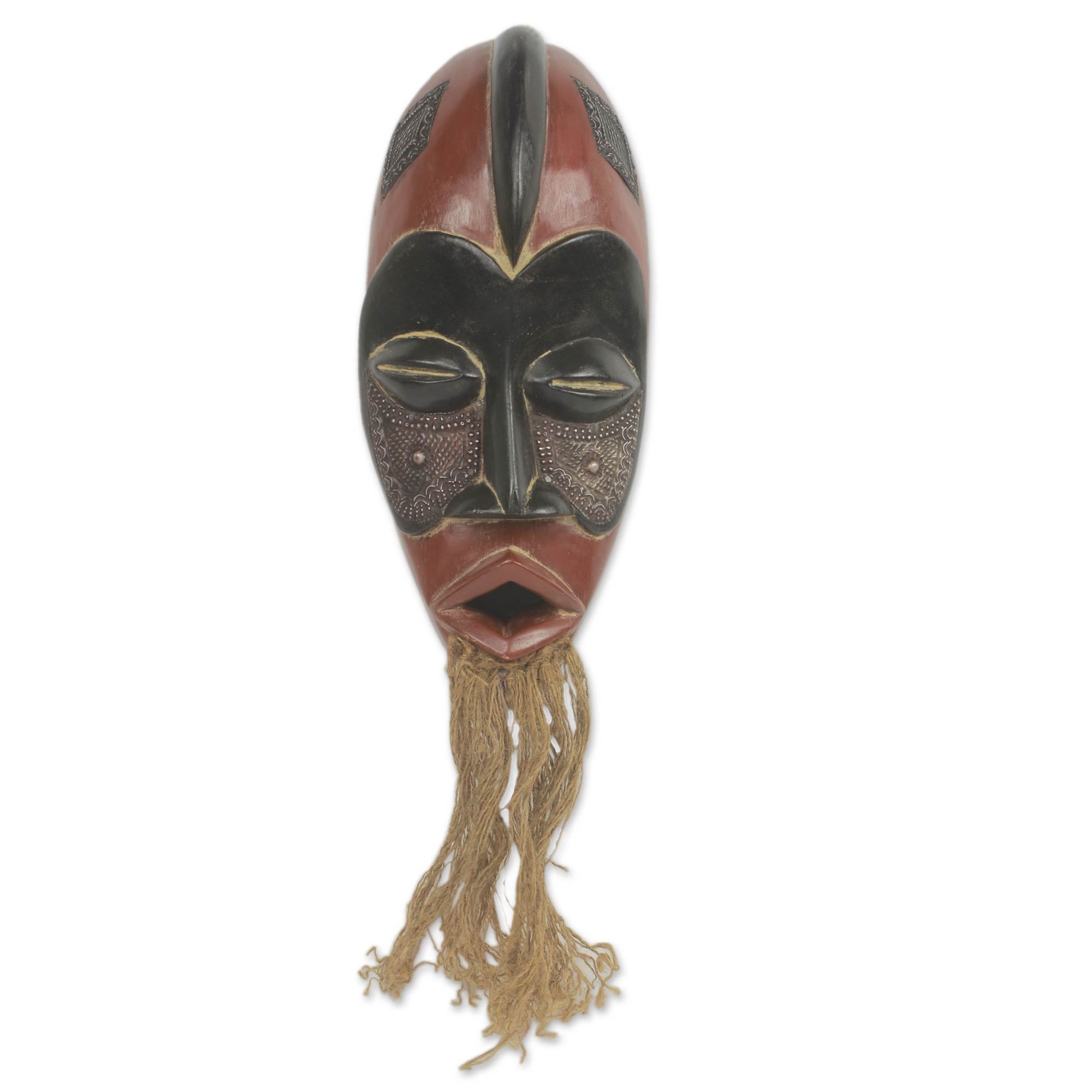 Original African Wood Mask with Jute Beard and Aluminum, 'Jungle Spirit'