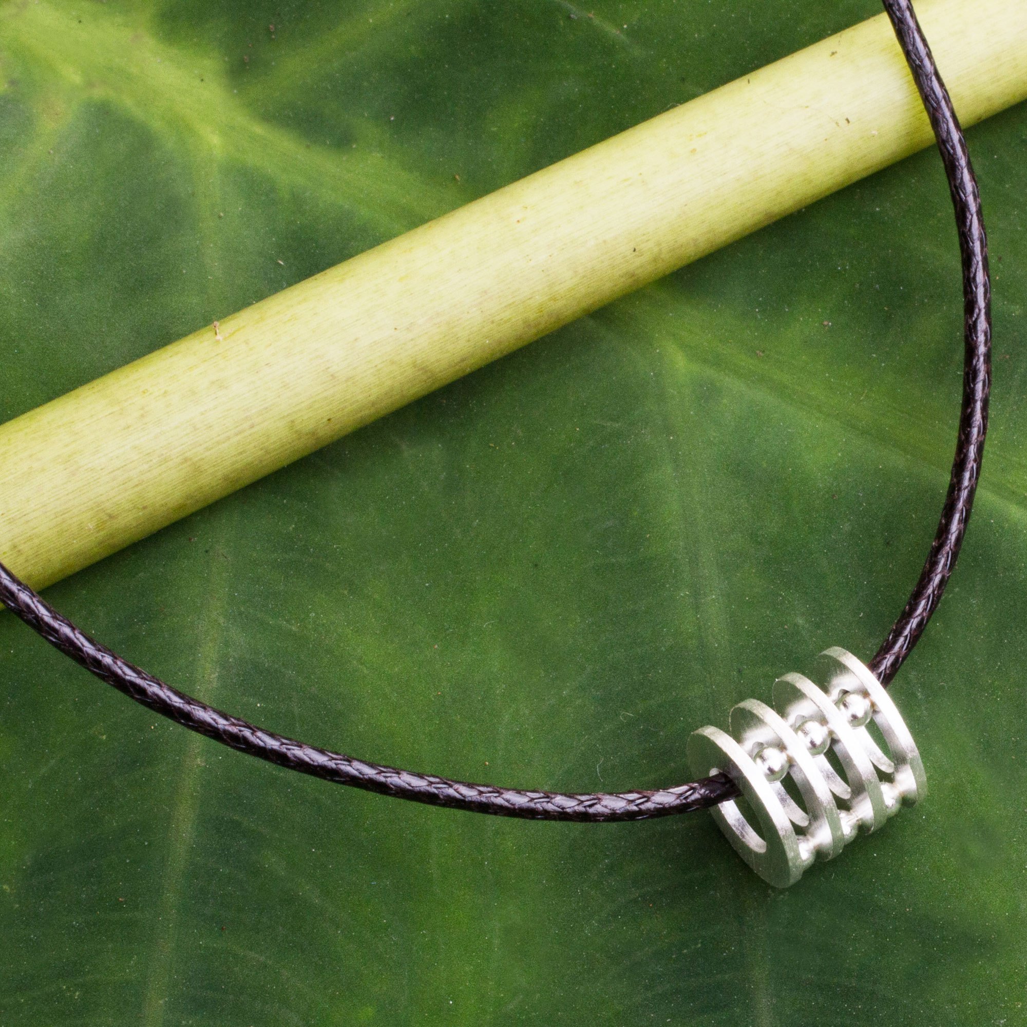 Like a modern day abacus, the sterling silver pendant on this necklace captivates with its original design. By Thailand's Sarote Lochotinunt, the handcrafted pendant is worn on a faux leather cord.