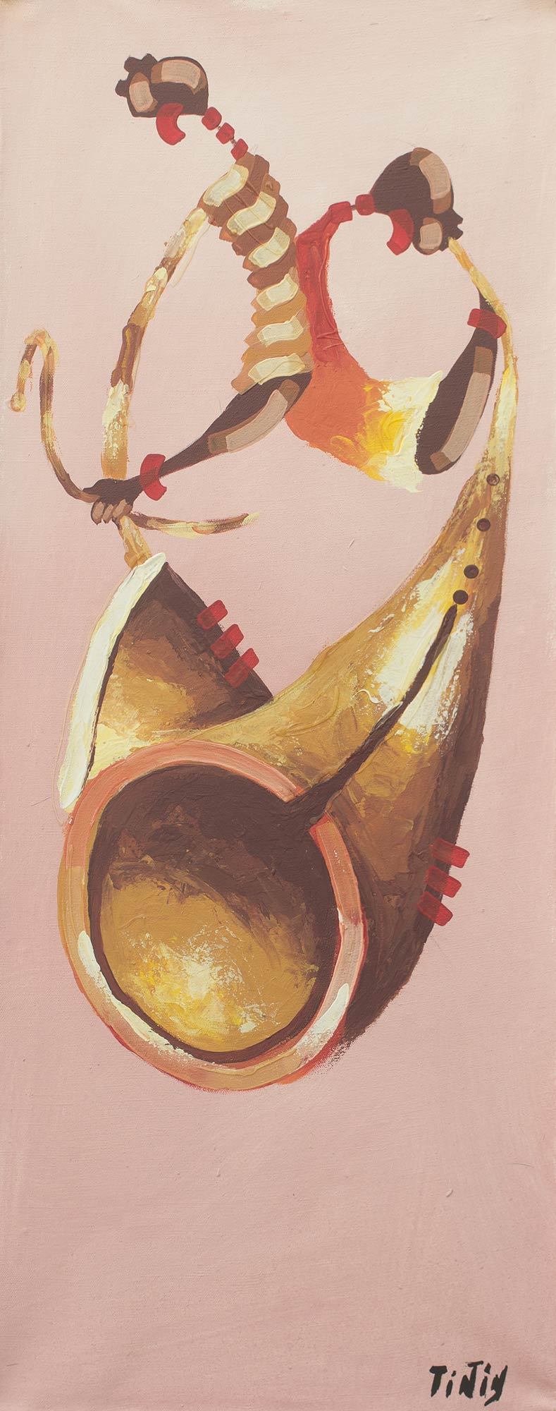 This handsome painting by Nana K. K. depicts two woman musicians. Abstract in style, it features a drummer on the left and a saxophonist on the right, both enveloped in a pale pink ambience.