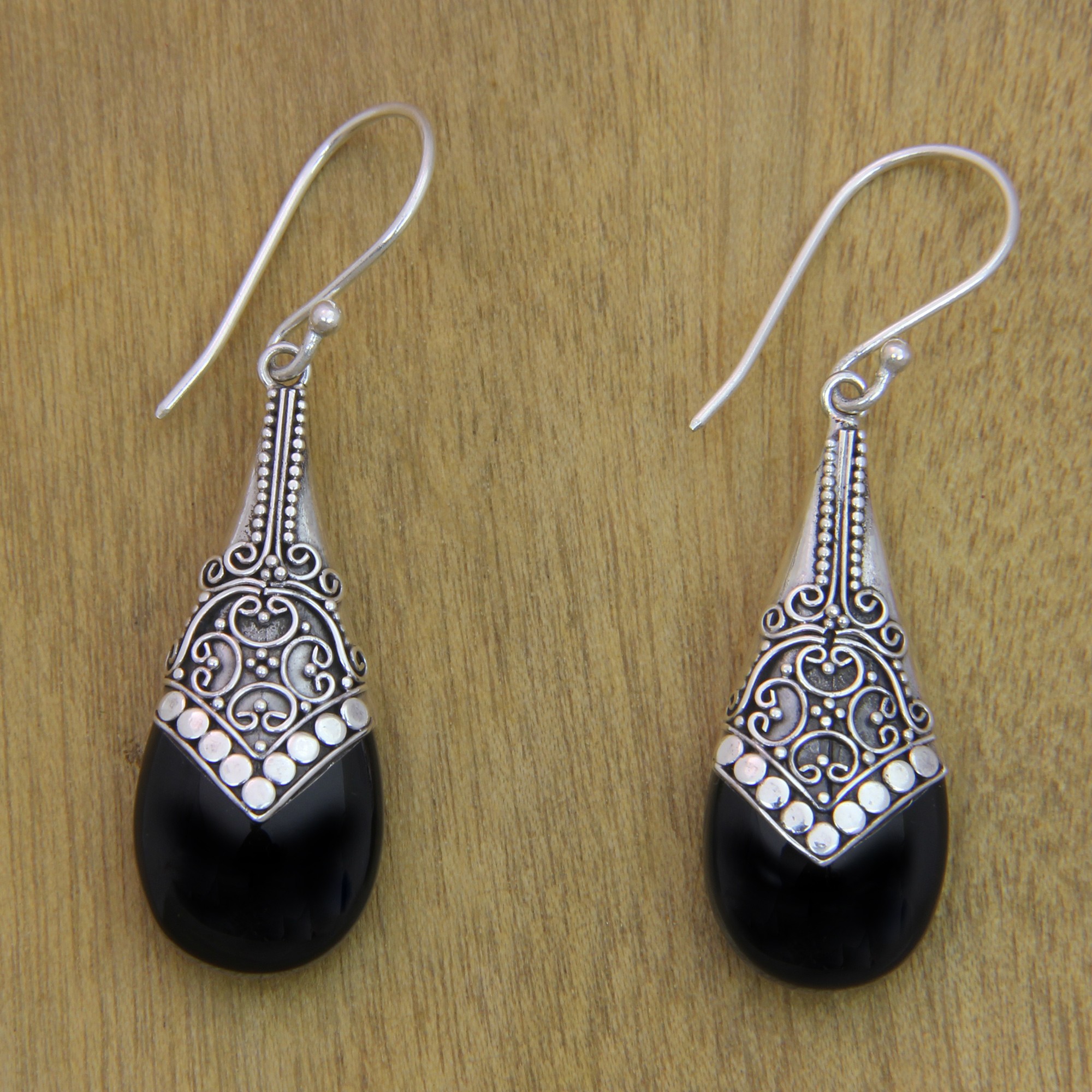 Balinese artisan Dewi Putera names this design for Puncak Jaya, the highest mountain in Indonesia and indeed in Oceania. Despite being just 4 degrees from the equator, it supports several glaciers on its slopes. These sterling silver dangle earrings feature ornately detailed cone shapes, further embellished by ebony onyx stones. The artisan adds the swirls and silver granules traditional to Balinese silverwork.