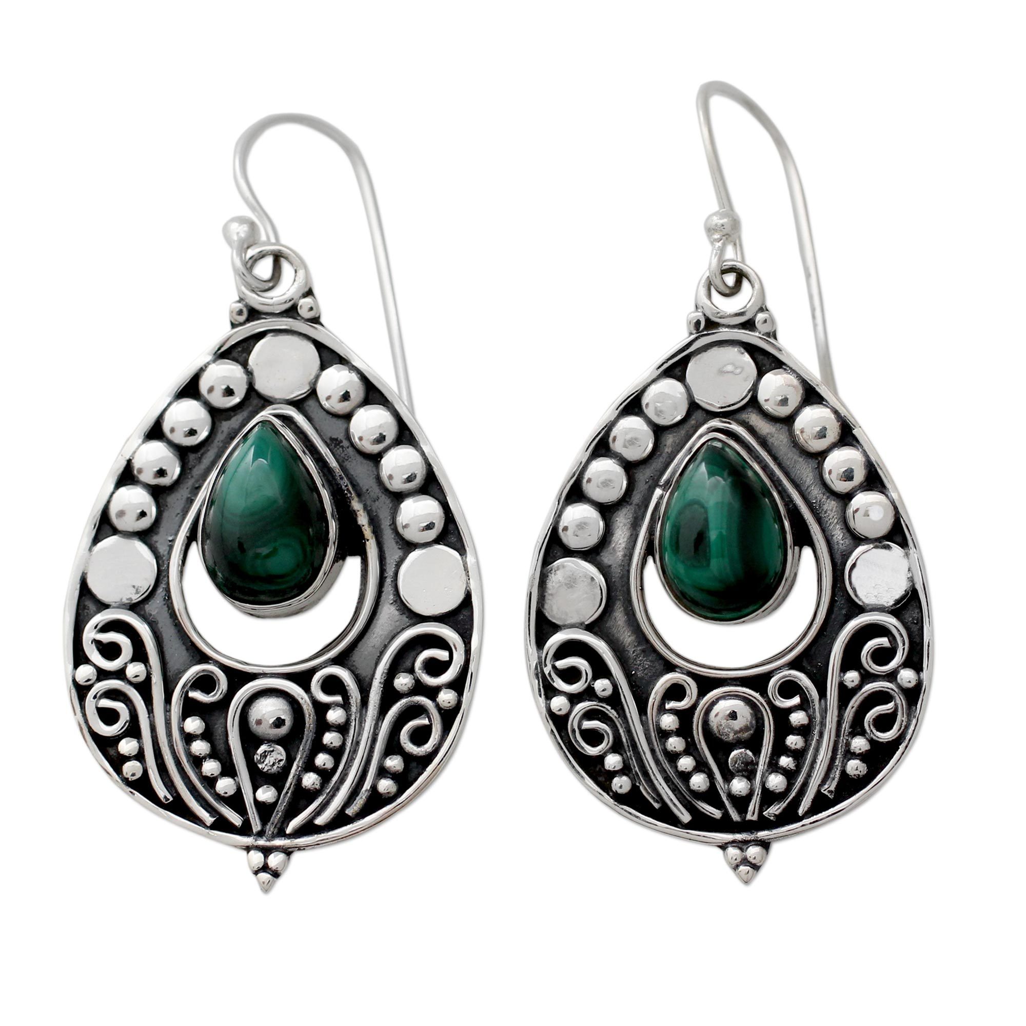 Intriguing malachite, with its swirling green depths, centers a memorable pair of earrings from Aparna in India. The sterling silver dangle earrings are ornately detailed with traditional rawa beading and wire work. An oxidized background emphasizes the pretty details.
