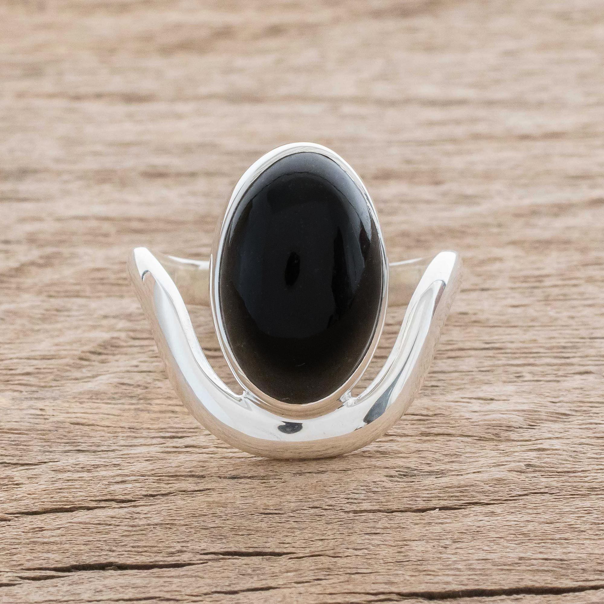 "Jade originates within the earth to dazzle all who wear it. The mixture of minerals and time make of jade a highly valued treasure. The design of this ring symbolizes how jade emerges from the earth," says the Jimenez Family of their original creation. They craft the sterling silver ring by hand, a powerful design rendered in aesthetic minimalism. The sterling silver frames an oval cabochon of black jade.