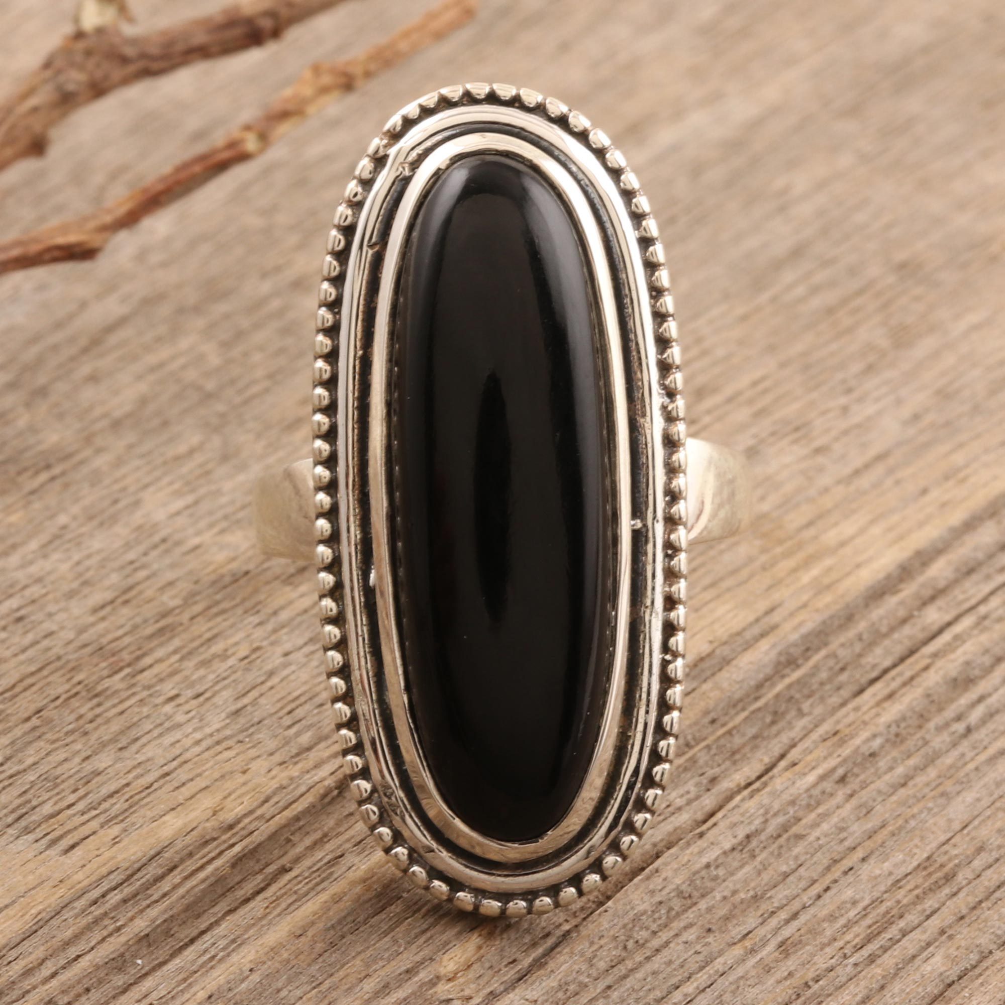 An elegant elongated cabochon of polished black onyx captures the essence of an evening on the town in this cocktail ring by India Chintan. The gemstone is encircled by a triple bezel of sterling silver, oxidized to enhance the fine details.