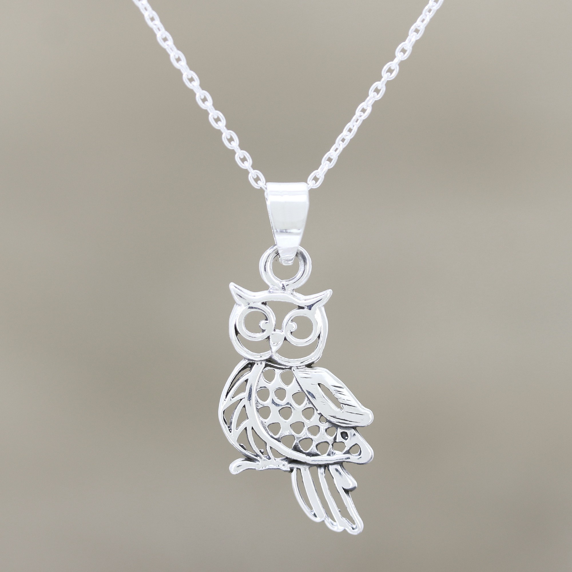 Owl Pendant Necklace Handmade in India, 'Jali Owl'