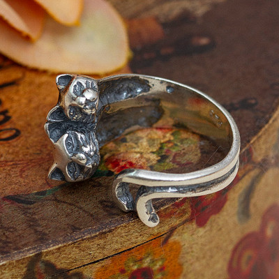 Oxidized and Polished Cat-Themed Sterling Silver Wrap Ring, 'Feline Soul'