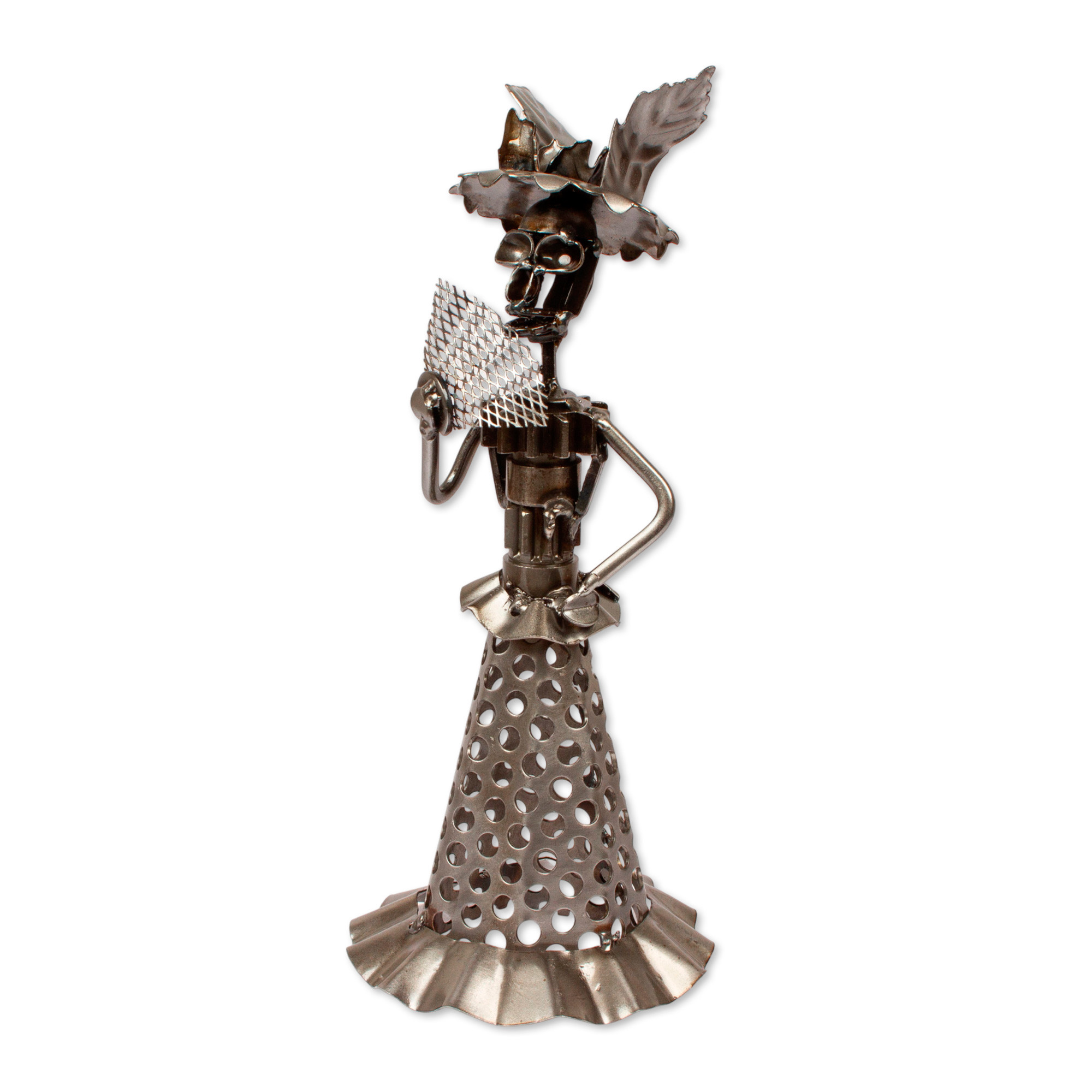 The always-vibrant Catrina enjoys a traditional night in this eco-friendly sculpture. Artisan Armando Ramirez of Mexico uses upcycled metal pieces to create Catrina's polka-dot dress, while oxidized finishes converge in each detail, evoking a memory from Day of the Dead.