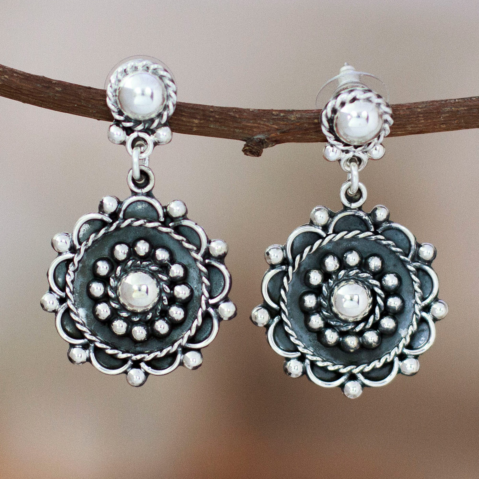 Oxidized Floral Taxco Sterling Silver Dangle Earrings, 'Baroque Spring'