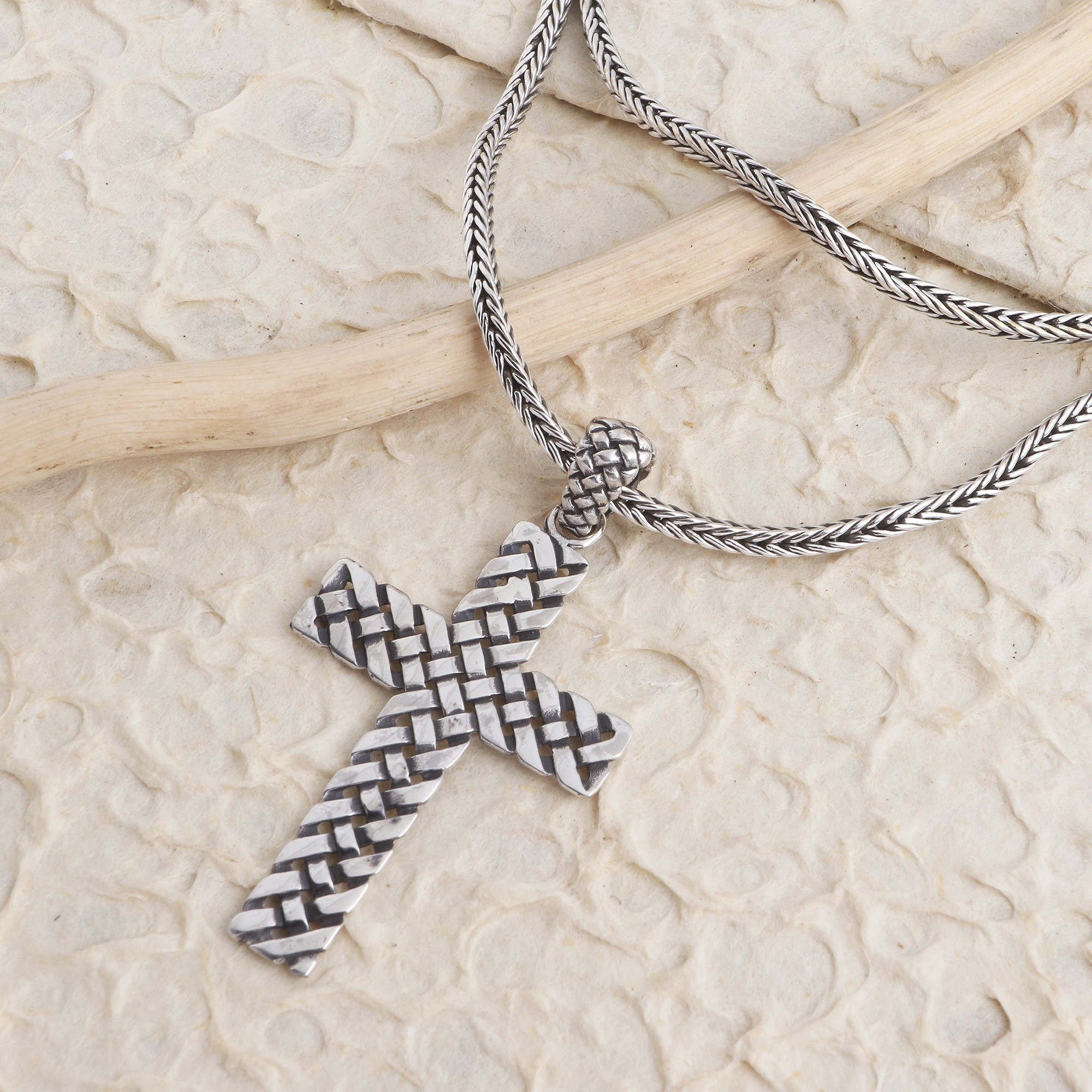 Selective oxidization augments the intricate basketweave detail of this cross pendant necklace from Bali's Nyoman Ariawan. Crafted using a combination of casting and handwork, the necklace features a basketweave bail and hangs from a foxtail chain.