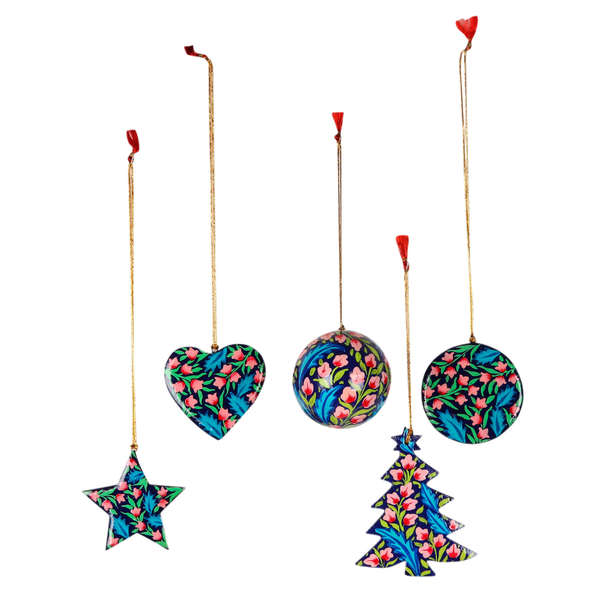 Sweet flowers and a magical blue hue merge in this set of six ornaments, a charming design by India's Syed Izaz Hussein. A bell, a heart, a star, a Christmas tree, a disc and a classic sphere compose the set's diverse artistry, all carved from weeping willow wood and painted by hand.