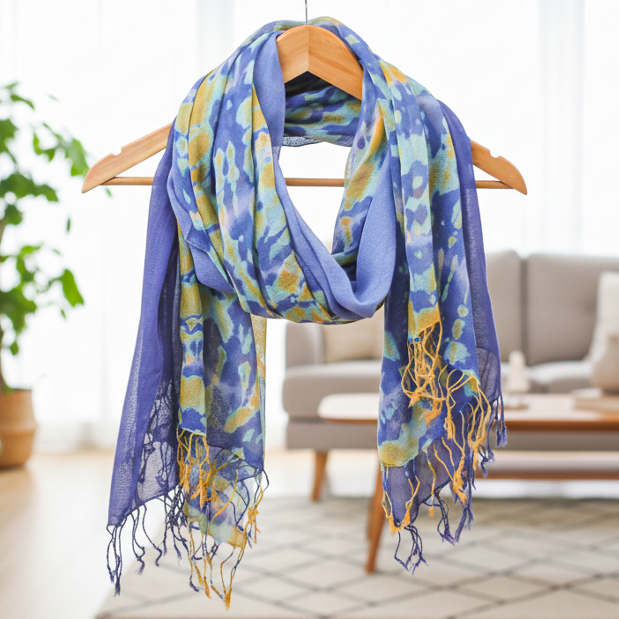 Pair of Cotton Tie-Dye Scarves in Blue and Yellow, 'Wave of Love'