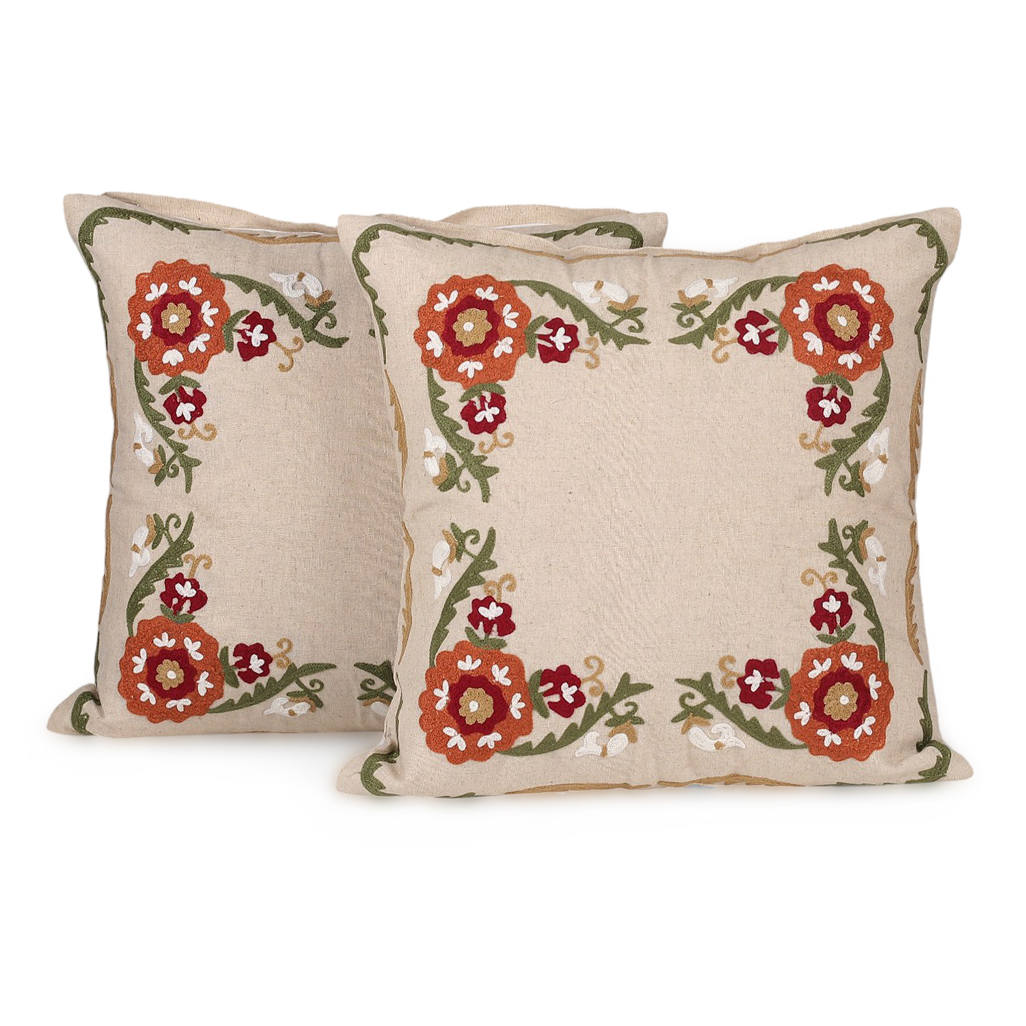 These gorgeous cotton cushion covers bring garden splendor to your space thanks to their detailed floral aari embroidery. Designed by India's Tapan Sarbadhikary, these covers anchor any room with their bold presence while maintaining the comfort you crave for daily lounging. The zippered closure makes styling effortless, letting these beautifully embroidered accents become the focal point your home has been waiting for.