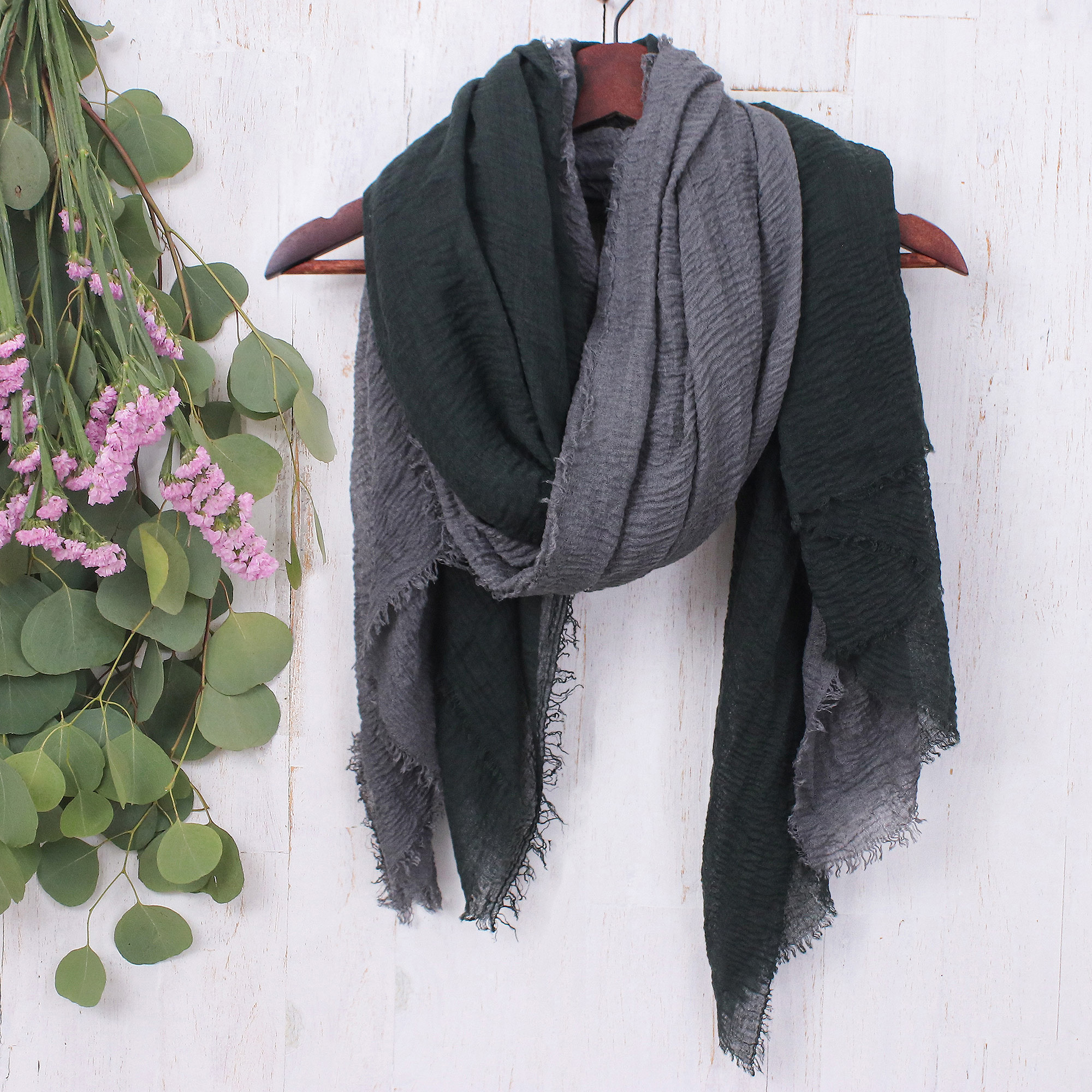 Thai artisan Kitthanapong creates breezy boho magic with this lightweight pair of scarves intricately handwoven from soft polyester. Their delicate fringes and elegant charcoal and pewter hues make them the perfect complement to any outfit. Wear one or both together for an effortlessly chic style.
