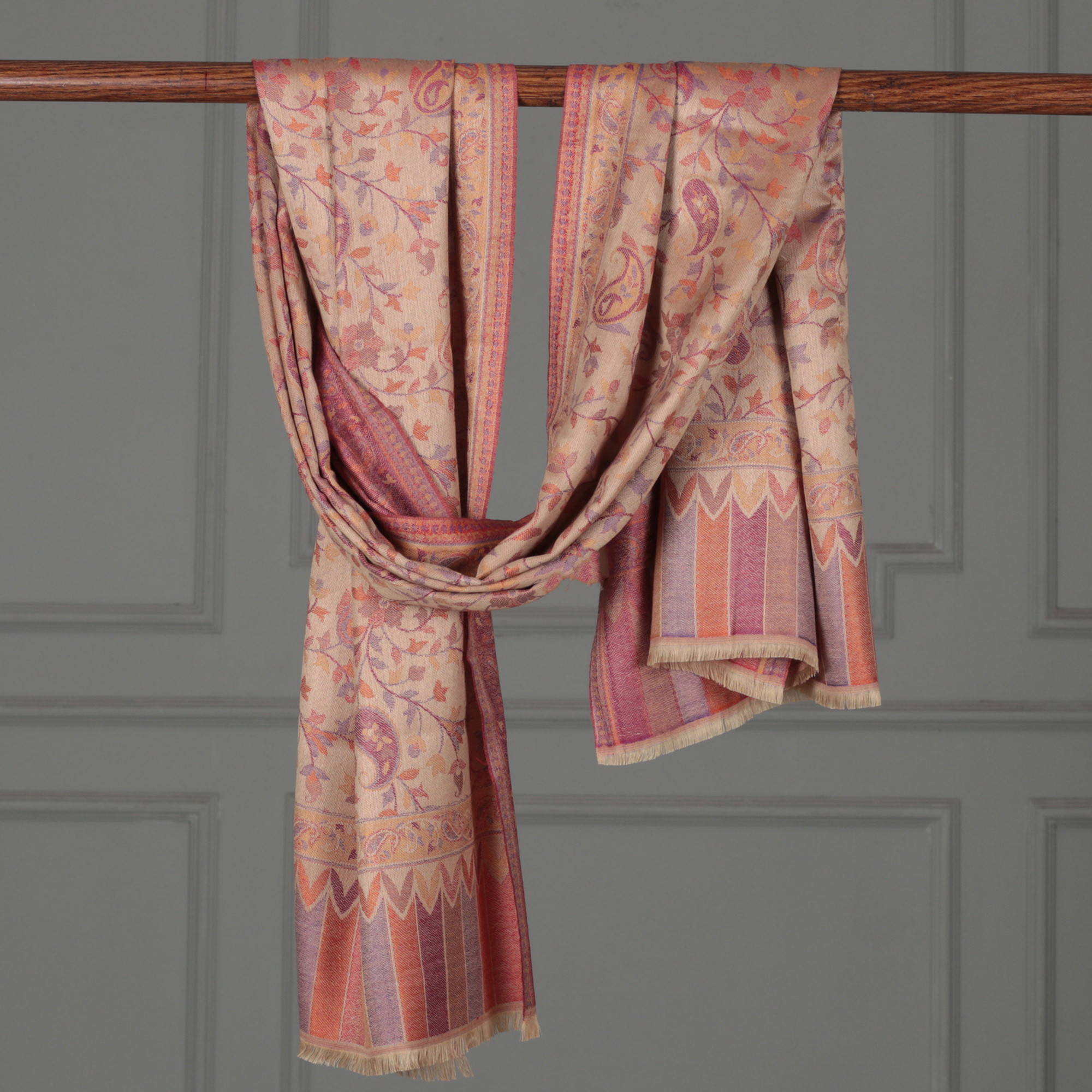 Tender and sweet as a joyous romance, this shawl arrives from India to dream about love and paisley beauty. Designer Amit Moza and a talented artisan team work with modal textiles to craft this fringed shawl, whose palette of creams, pinks and purples dances around leafy details.