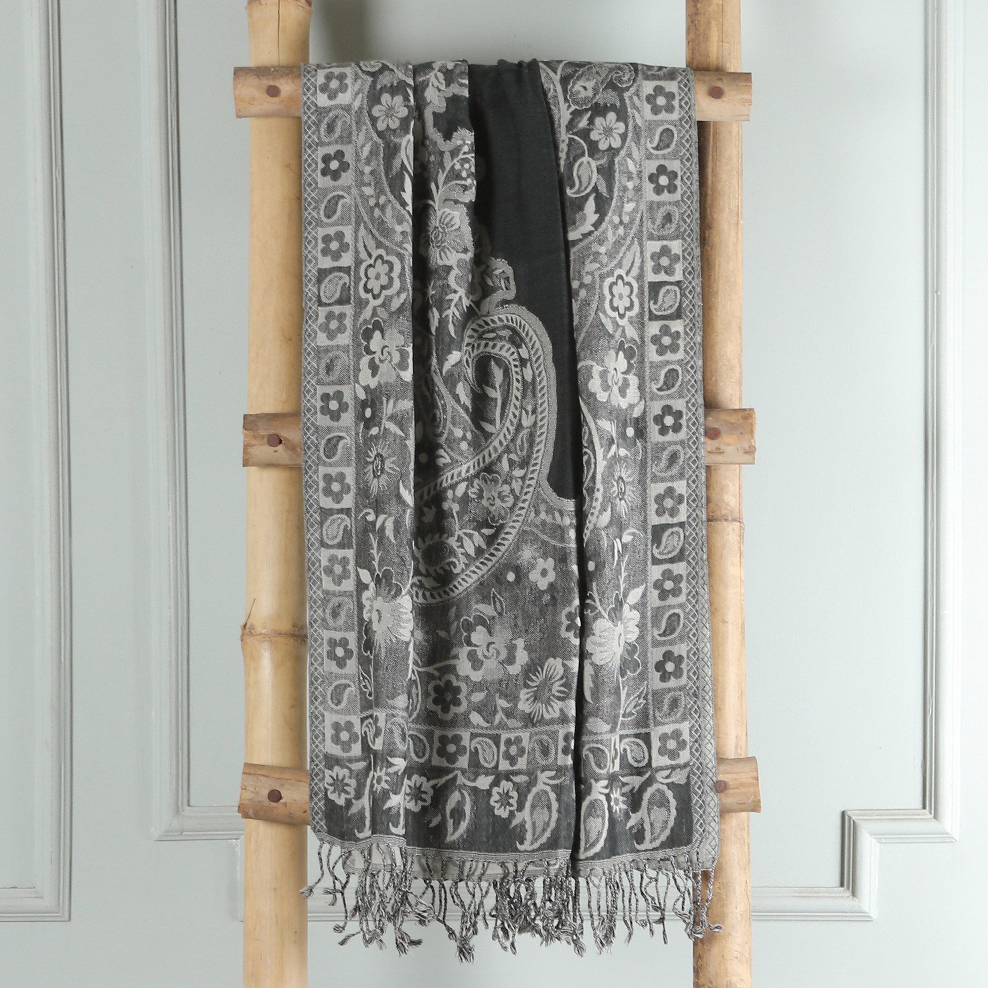 Glamour and elegance always leave a mark, just as this paisley-inspired shawl will do on your nights. Sandeep Malhotra's artisan team, from India, works with refined wool yarns in grey and black hues to craft the shawl's stunning paisley pattern, enhanced by fringes.