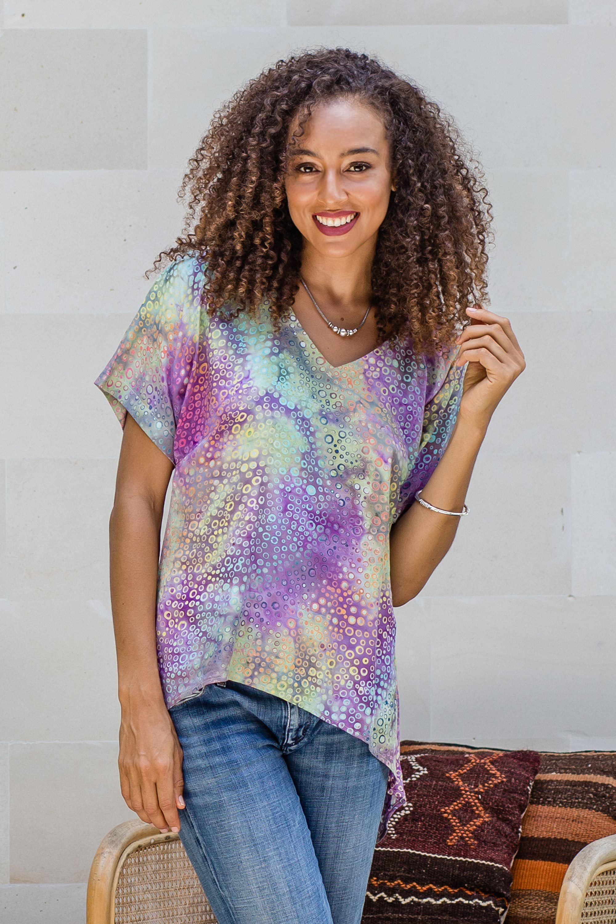 Pastel Batik Hi-Low Rayon Blouse, 'Pastel Bubbles'