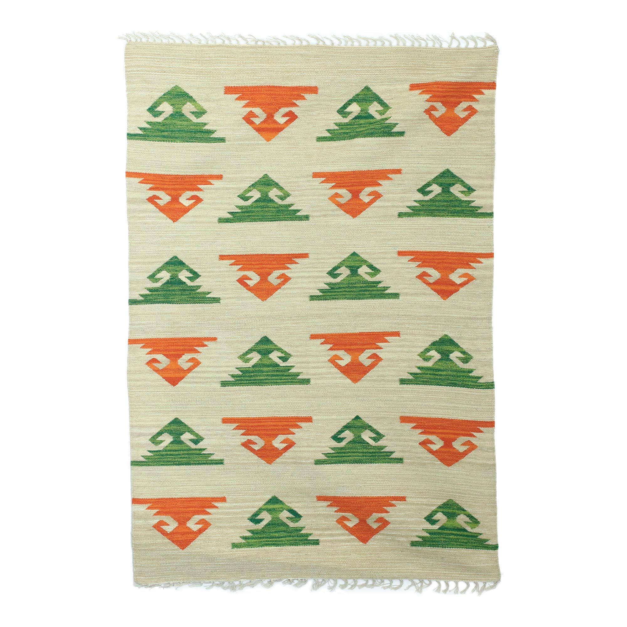 Patterned Handwoven Orange and Green Wool Dhurrie Rug (4x6), 'Woven Crowns'