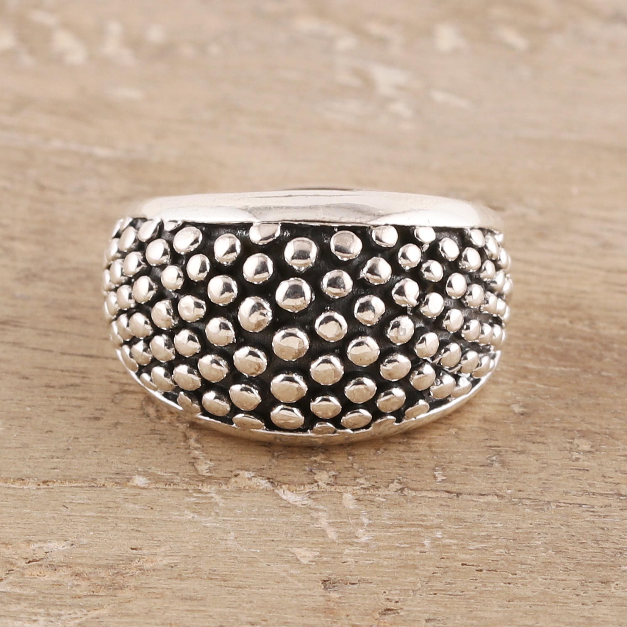 Like shiny pebbles that pave a dark road, handcrafted circular patterns of sterling silver decorate the front of this band ring from India. Shivani Choudhary designs a ring that is crafted with a simple band of sterling silver.