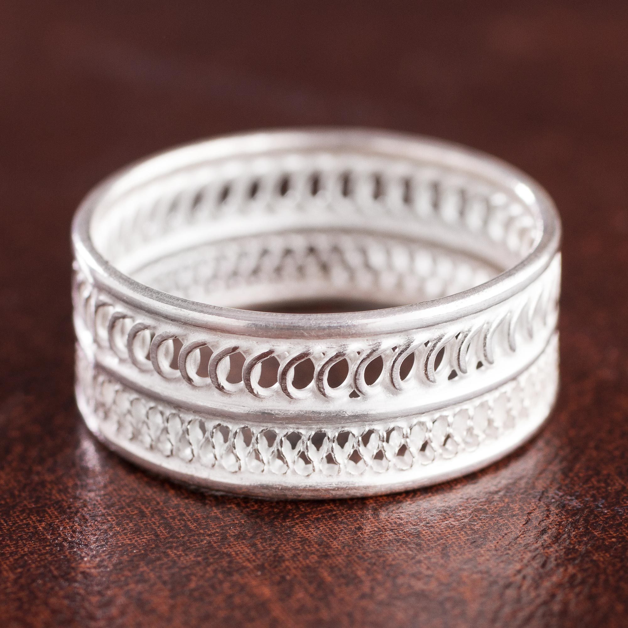 Patterned Sterling Silver Filigree Band Ring from Peru, 'Attractive Form'