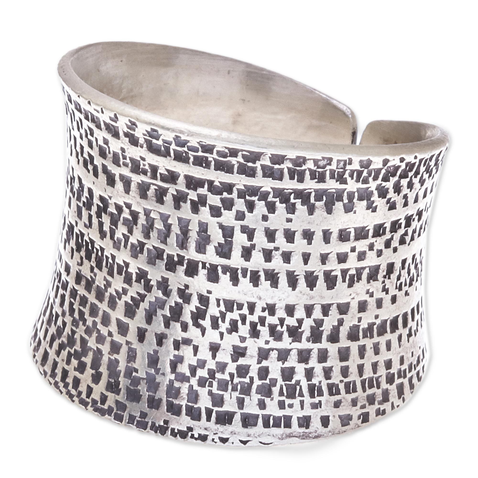 Featuring intricate oxidized patterns that contrast with its high-polish finish, this modern wrap ring is handcrafted of sterling silver. Thailand's Achara works with local artisans to present this beautiful accessory.