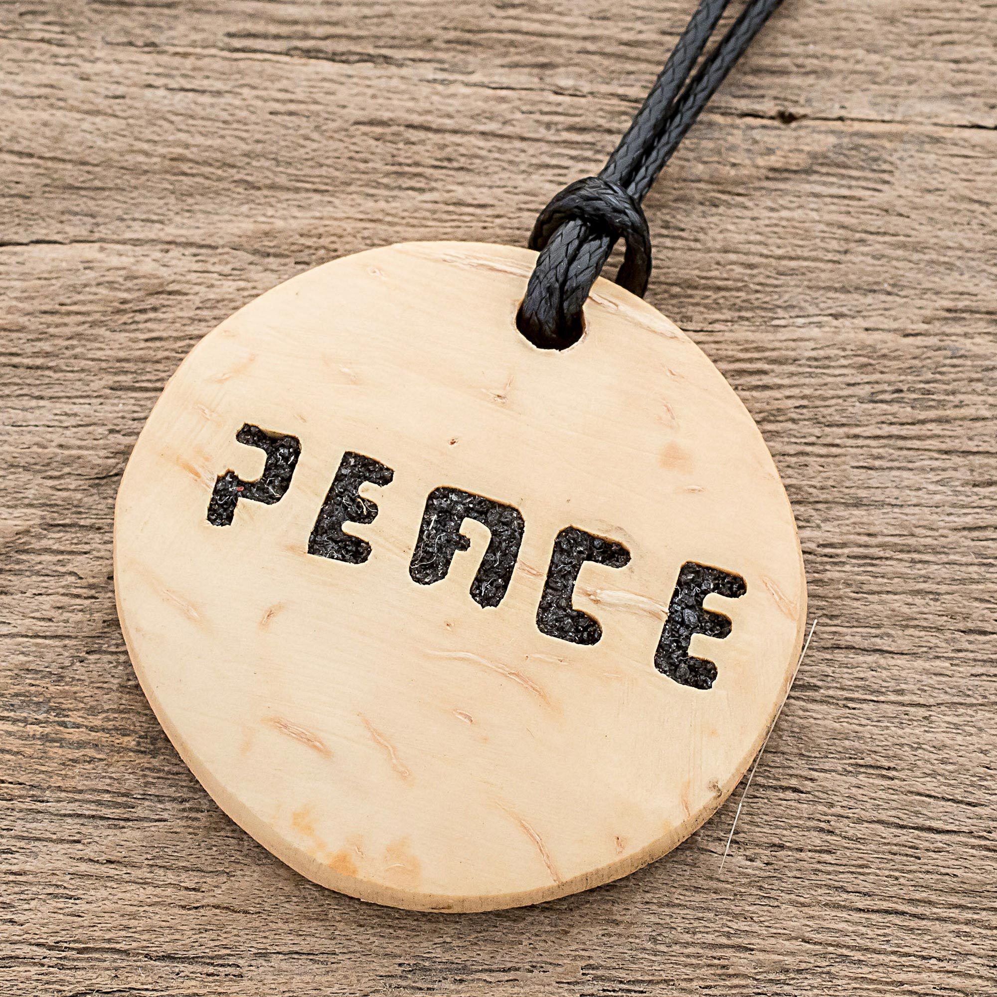 Working with a circular piece of coconut shell, Guatemalan artisans Fernando and David create this inspirational pendant necklace. Within the coconut shell pendant, the word "Peace" is carved and filled with lava stone and resin for a striking contrast. The pendant centers an adjustable length of black nylon cord.