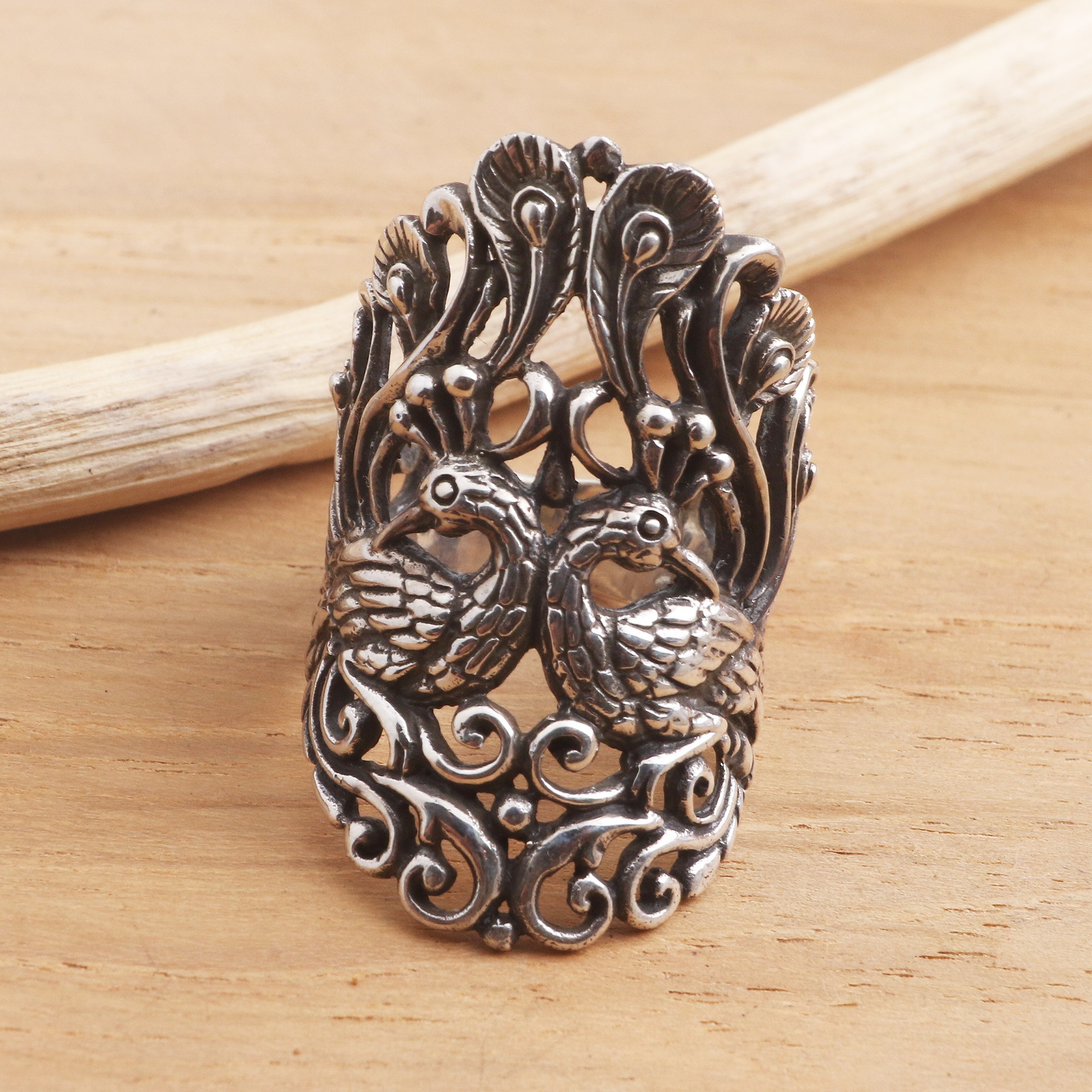 Attention to detail makes this sterling silver ring a wearable piece of art. Nyoman Ariawan designs the ring, which features a pair of courting peacocks.