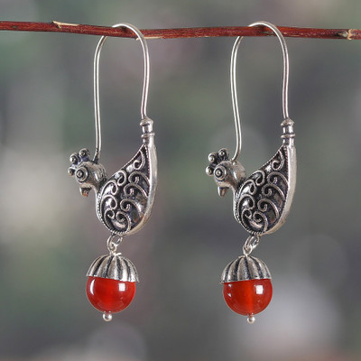 Peacock-Themed Silver Dangle Earrings with Carnelian Stones, 'Peacock Whispers'