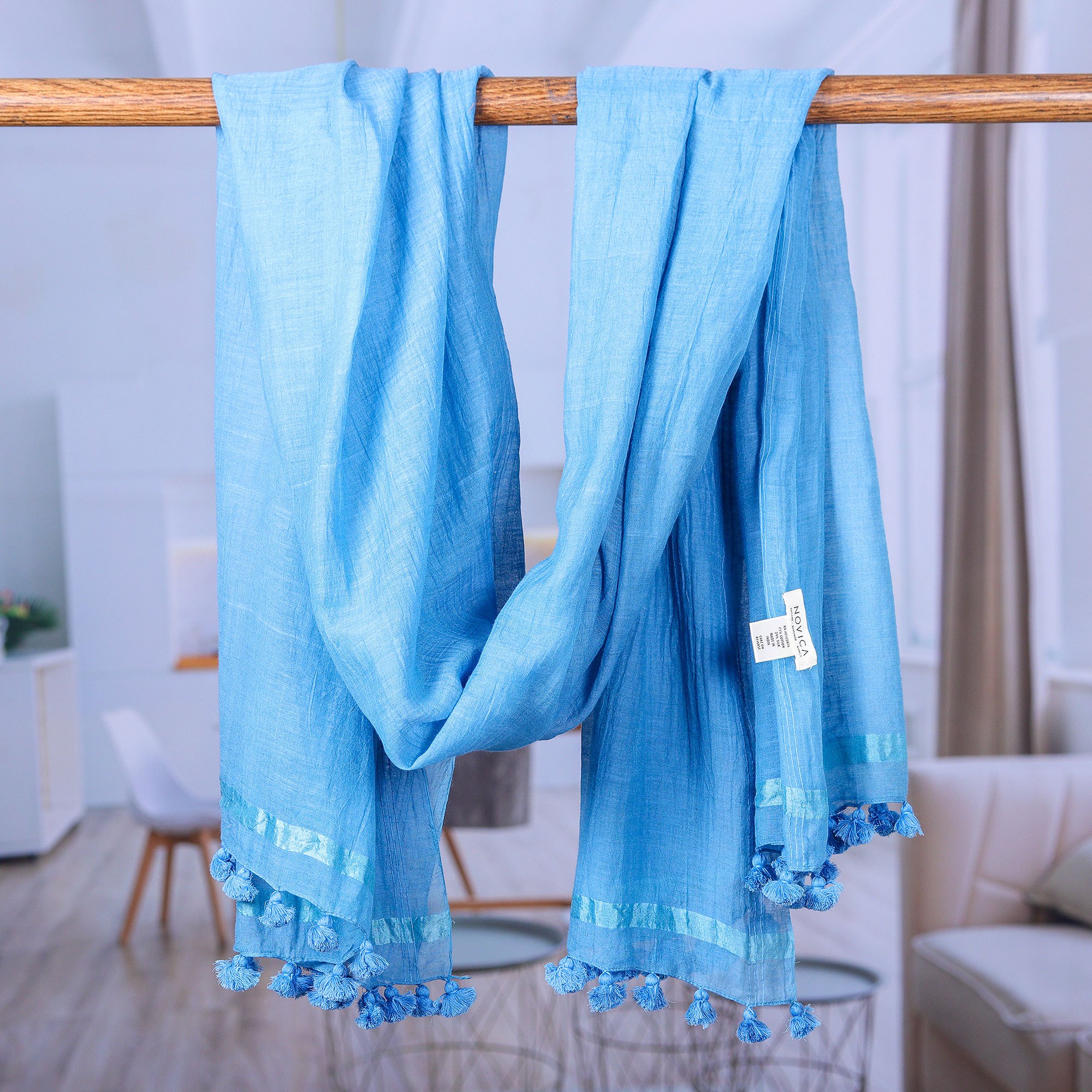 Arnab Roy and his team of talented Indian artisans create a stylish collection inspired by elegance and luxury. Following the advanced techniques that make Indian textiles unique and marvelous, the team uses a loom to create this exquisite shawl, whose cotton and silk blend yarns allow for a beautiful drape and comfortable sensation. The garment comes in a peacock hue and is adorned with tassels that evoke the region's glamour.