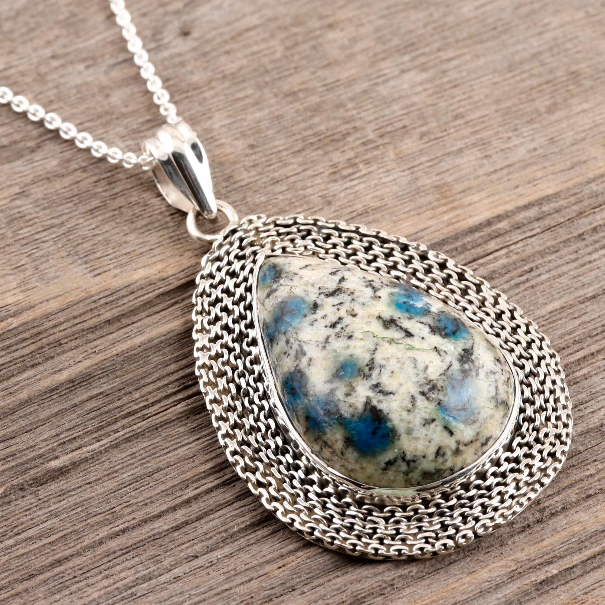 Wrapped in rows of sterling silver rolo chain and set within a polished bezel, this pear-shaped jasper cabochon pendant necklace is the creation of India's Rakesh Rana. K2 jasper, also known as K2 granite, is actually granite with round deposits of azurite. The unusual stone is found only in remote mountain areas in Pakistan.