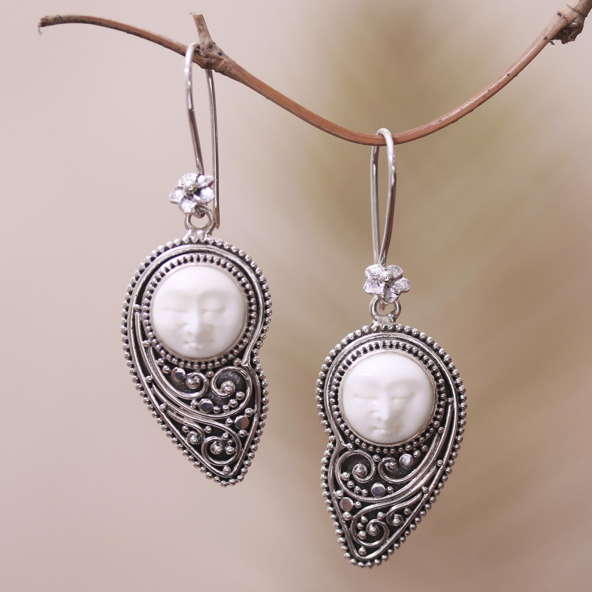 Hand-carved from bone, two serene faces are framed by pear shapes of sterling silver, detailed with intricate wire and dot work that is treated with a combination of finishes. Balinese artisan Buana creates these elegant dangle earrings, which swing from floral hooks.