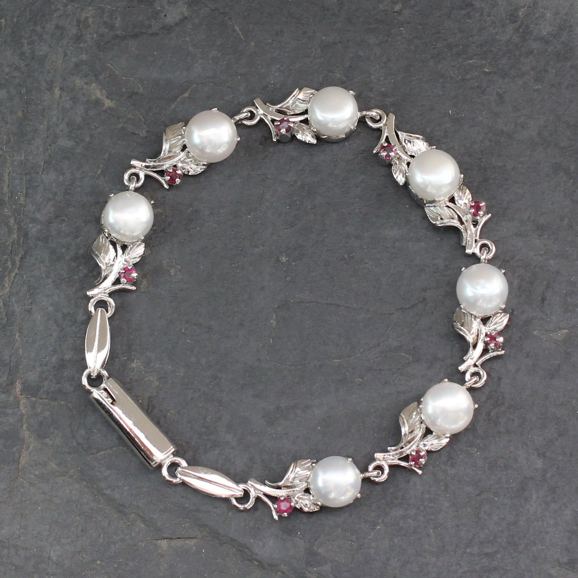 Pristine and lovely, white pearls grace an exquisite design from Alok Jain. Caressed by sterling foliage and red rubies, the bracelet is lovingly crafted by hand.