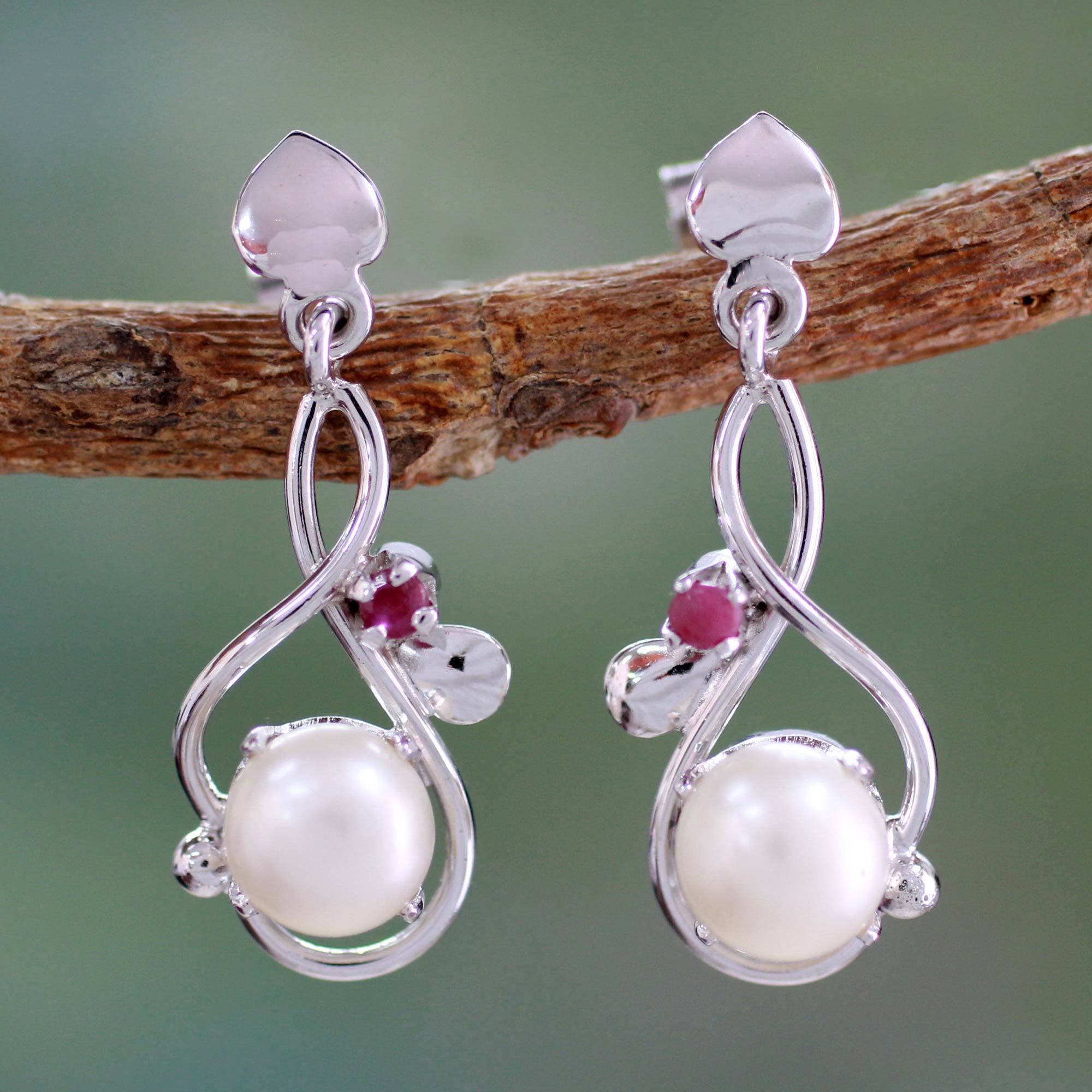 Pearl and Ruby Sterling Silver Drop Earrings, 'Cradle Song'