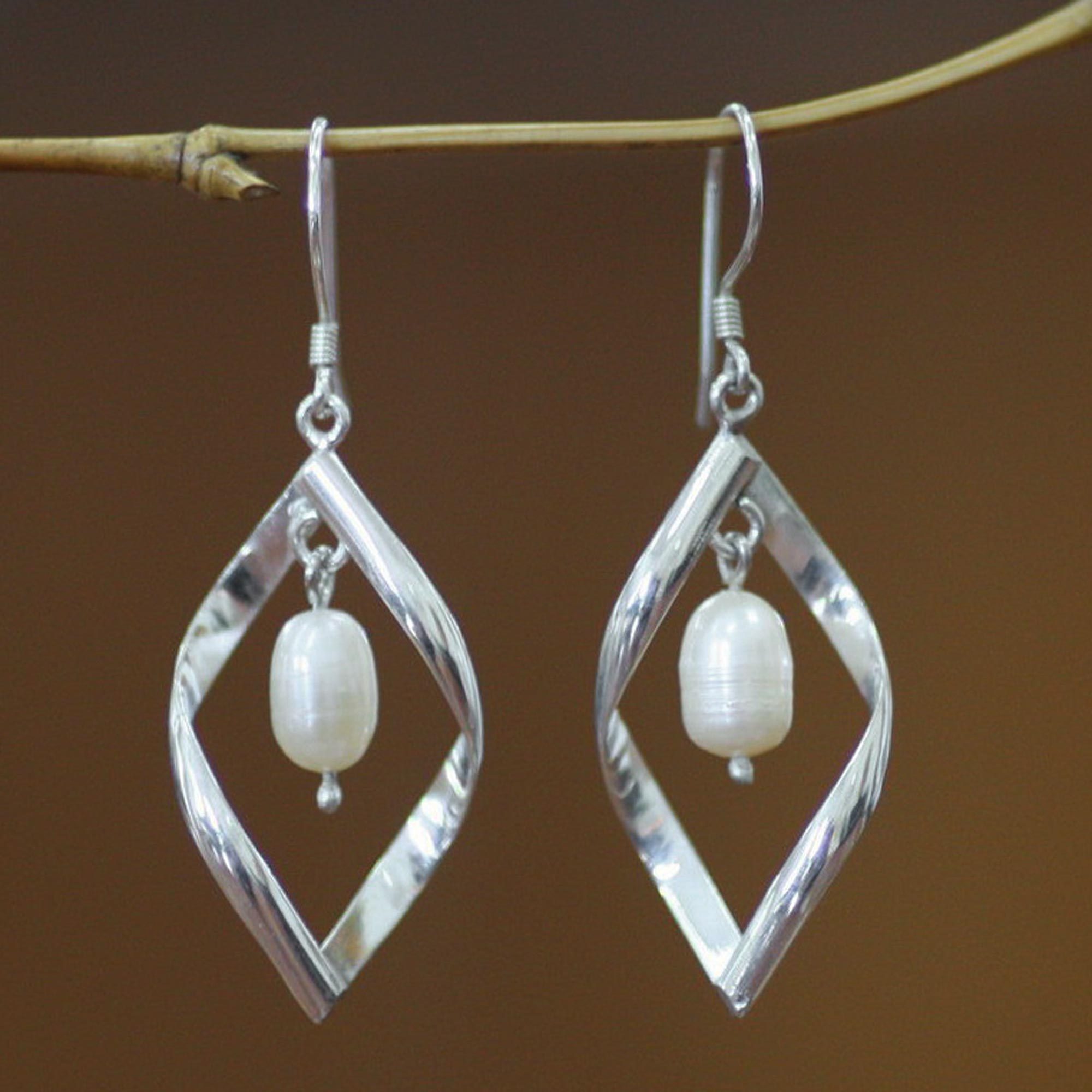 A ribbon of silver twists and turns to repeat its infinite journey. By Wayan Asmana, these earrings are beautifully modern. Inside the abstract shapes, a single white pearl performs a quiet dance with every movement.