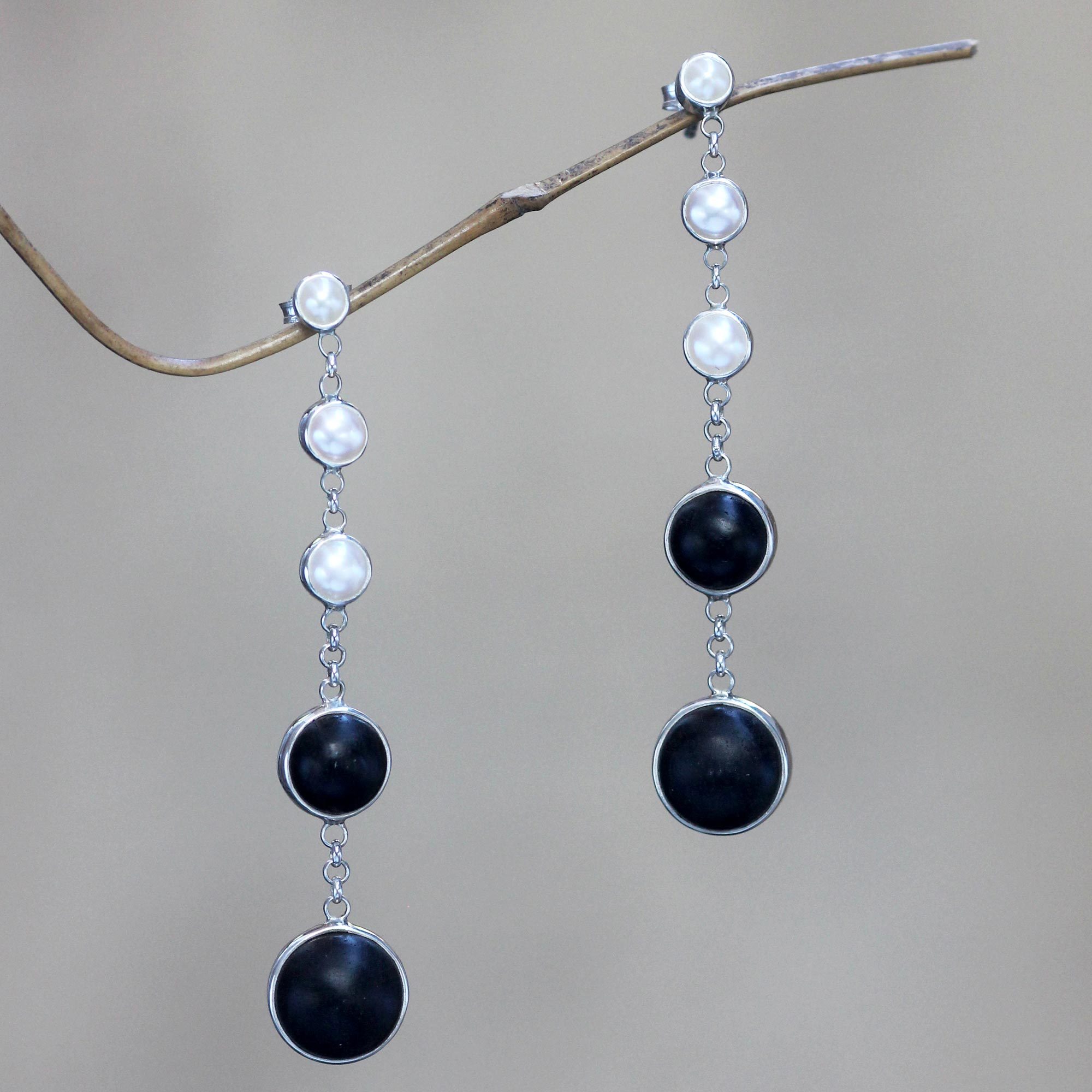 These earrings will look beautiful dangling from the ears. Made by Caine, these fabulous earrings are made with .925 sterling silver. The variation between black and white pearls makes these a bold statement piece.