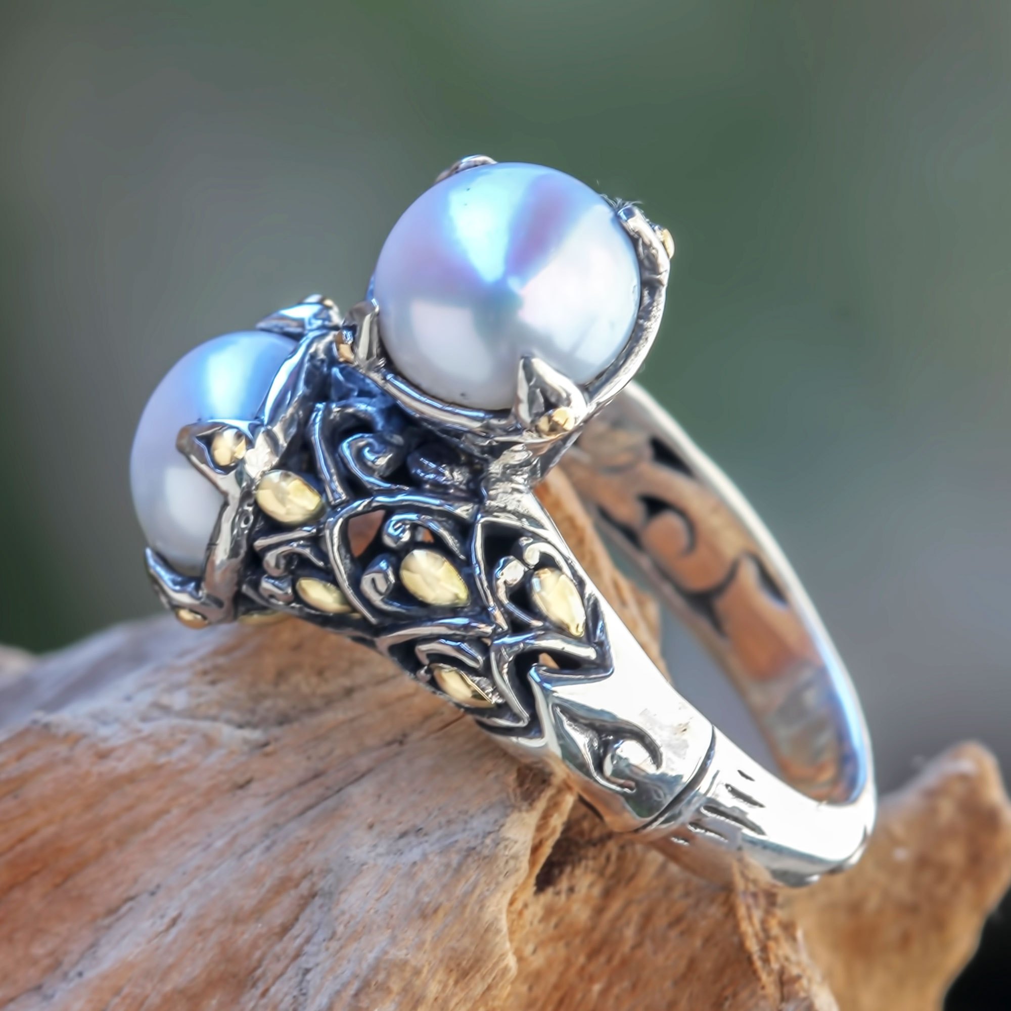 Centered by golden accents, sterling silver petals cascade from silvery white pearl buds in the stunning design of this ring. By Kadek Hendra in Bali, the sterling silver ring is crafted with 18k gold plated accents.