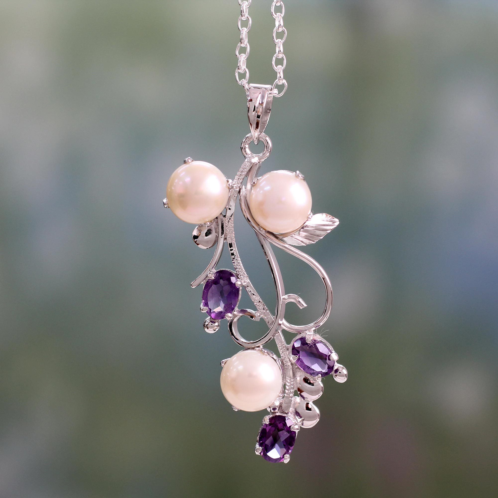 Creamy cultured pearls and amethysts combine in a necklace of unbridled femininity from Alok Jain. The artisan sets the gems in gleaming rhodium plated sterling silver and centers the pendant on a silver cable chain.