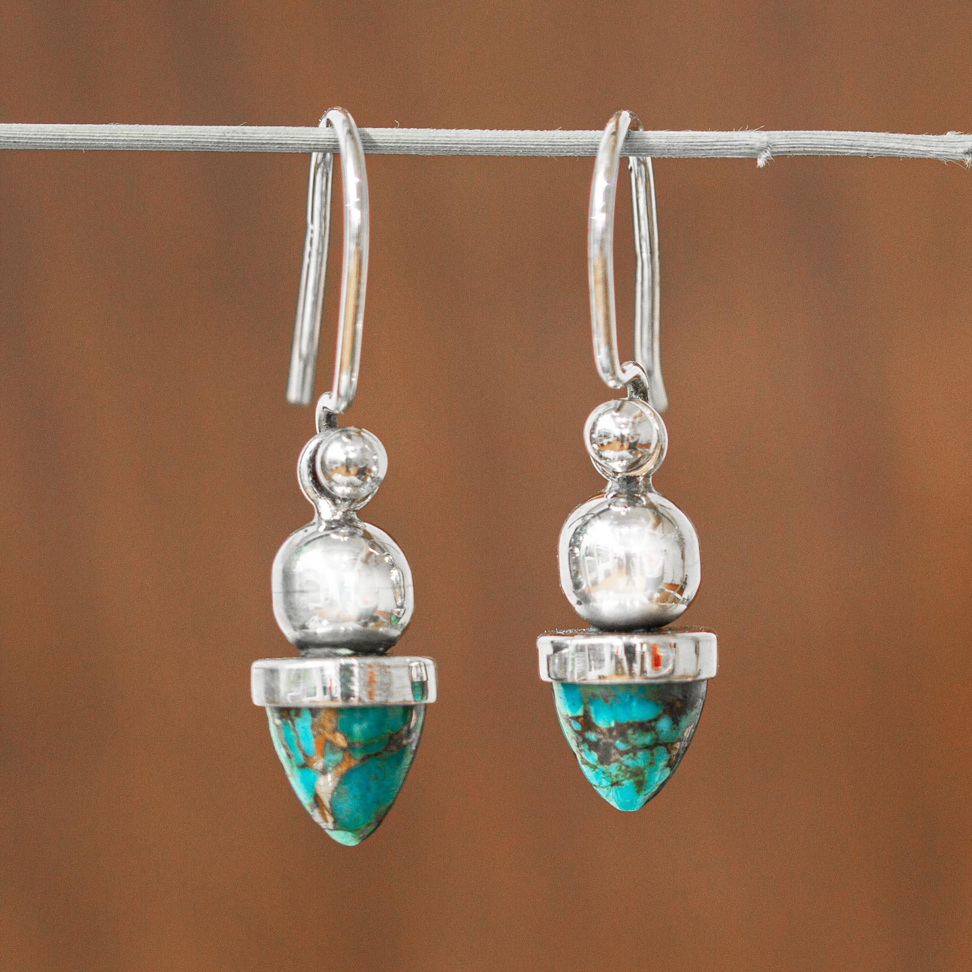 Beautiful blue hues with golden veins shine brightly from these stunning composite turquoise dangle earrings by Mexico's Guillermo Arregui. The composite turquoise evokes pendulums that hang from high-polish Taxco silver, giving these earrings their unique and elegant look.