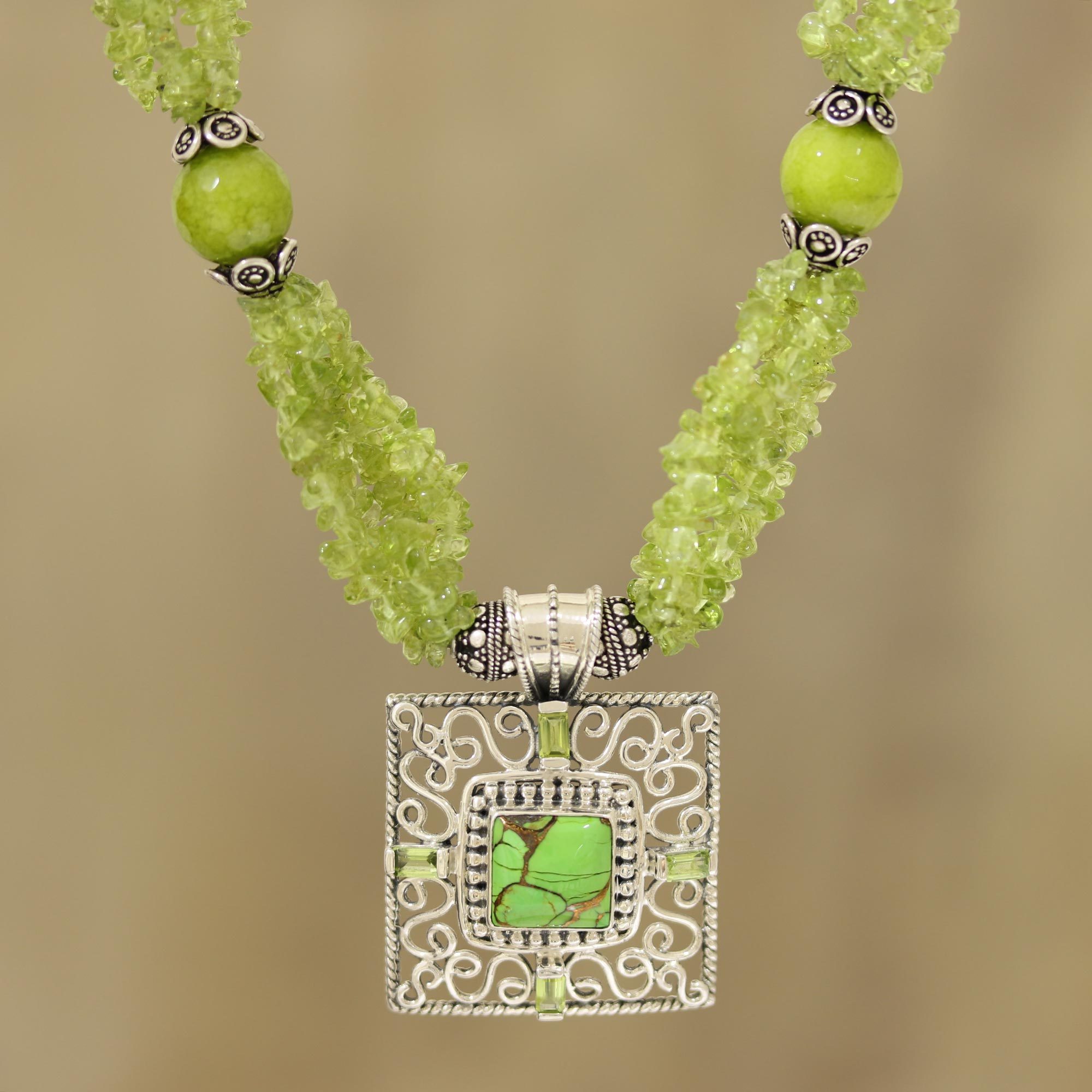 Peridot and Composite Turquoise Beaded Pendant Necklace, 'Verdant Square'