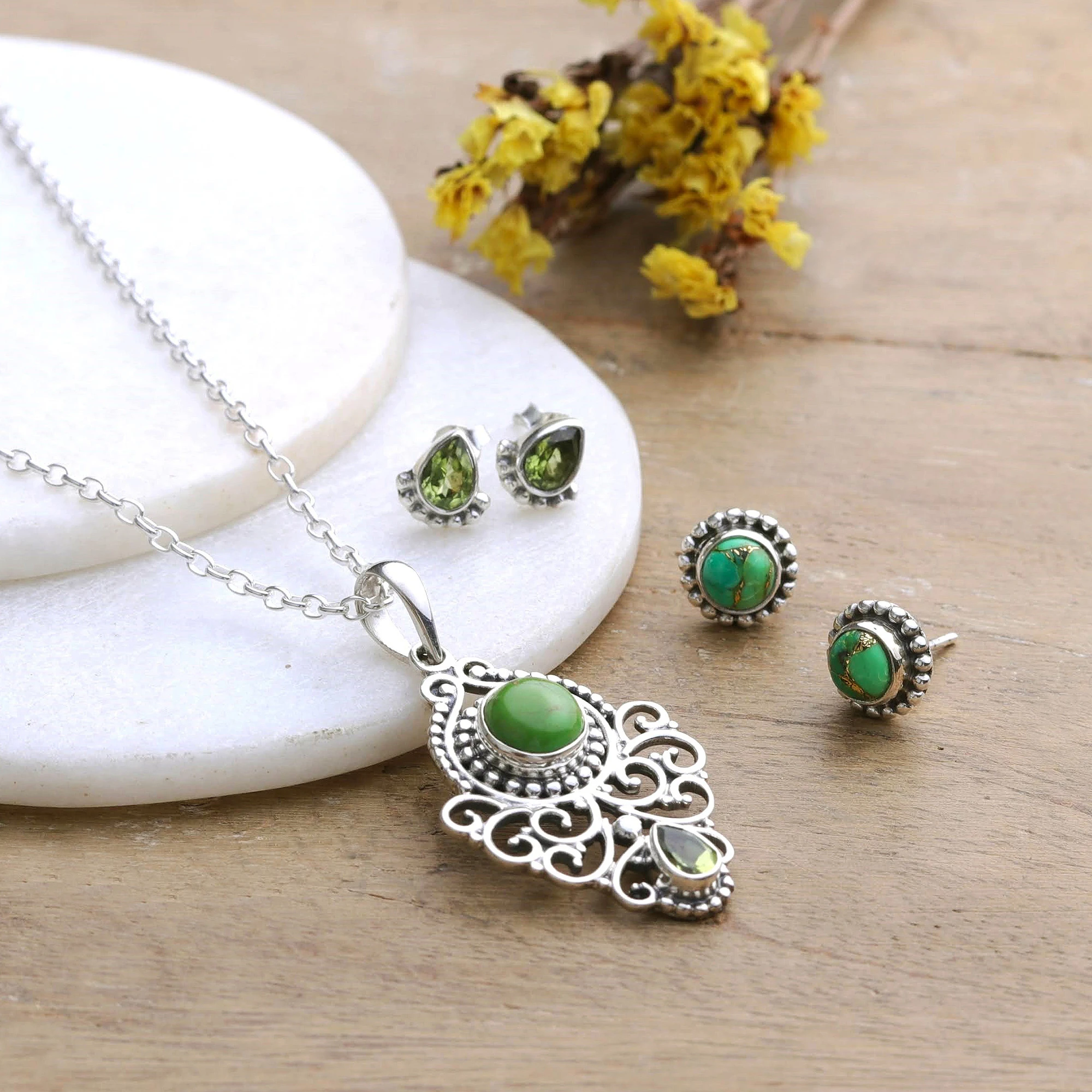 Dangling gracefully from a sterling silver chain, this necklace's pendant displays a harmonious aura in each of its classic details. Presented by Neeru Goel and crafted in India, this gorgeous accessory is part of a jewelry set that includes two pairs of stud earrings: one featuring natural peridot stones totaling over one carat and the other adorned with composite turquoise gems—both of these jewels also present in the necklace.
