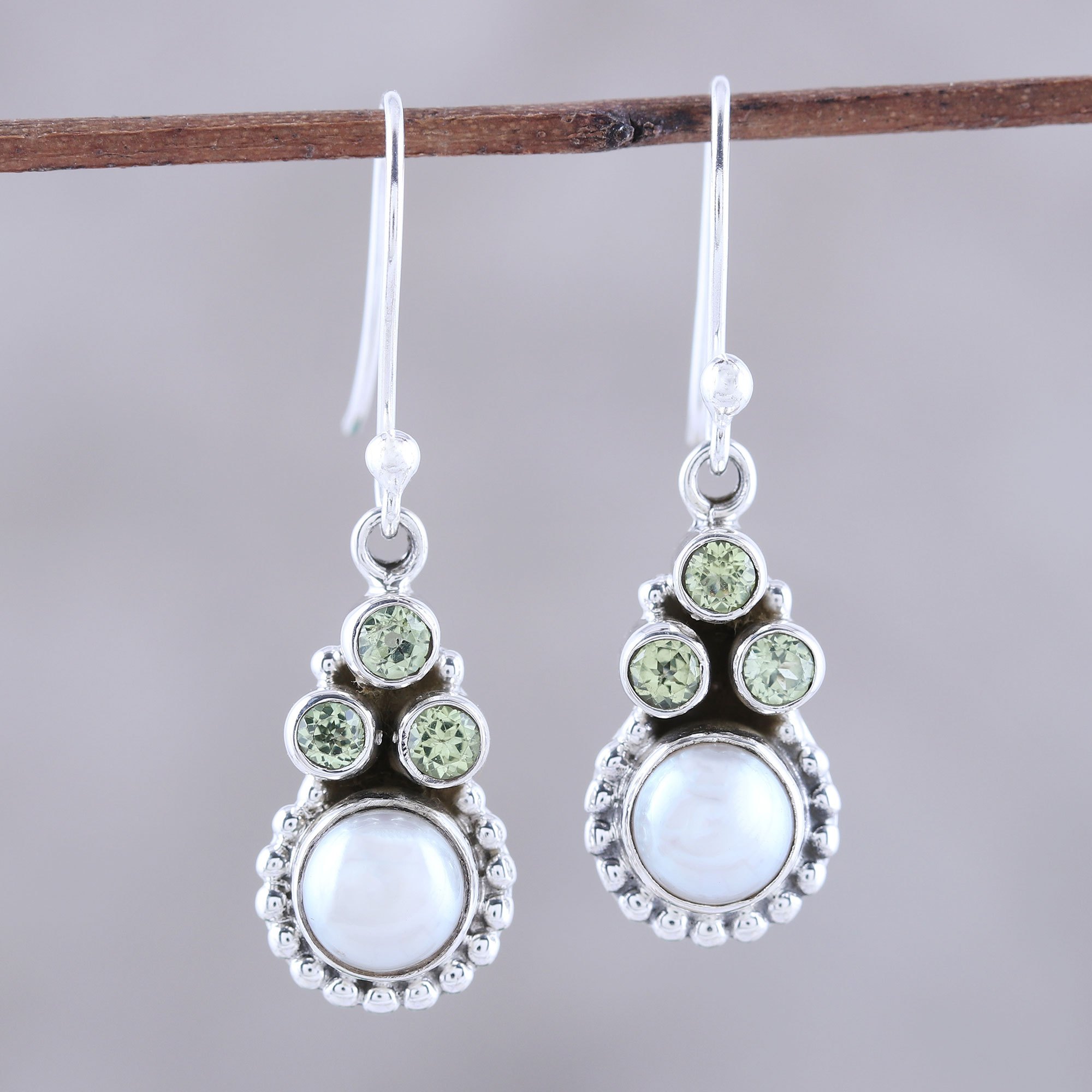 Peridot and Cultured Pearl Dangle Earrings from India, 'Petite Flowers'